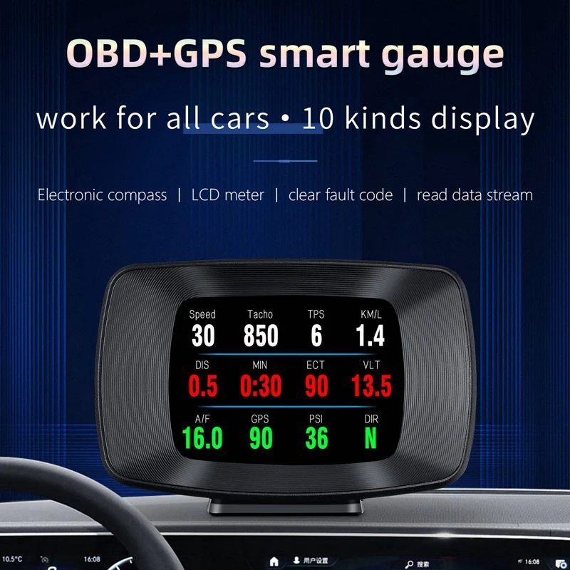 Функция режима OBD: скорость транспортного средства, температура воды, напряжение, расход топлива, скорость, один пробег, общий пробег, совокупное время в пути, направление движения, количество звезд, высота, часы, давление впуска, температура масла, соотношение воздуха и топлива, турбо давление, дроссельная заслонка, температура впуска, нагрузка двигателя, Испытание на ускорение, испытание на тормоз, Определение неисправности, четкий код неисправности