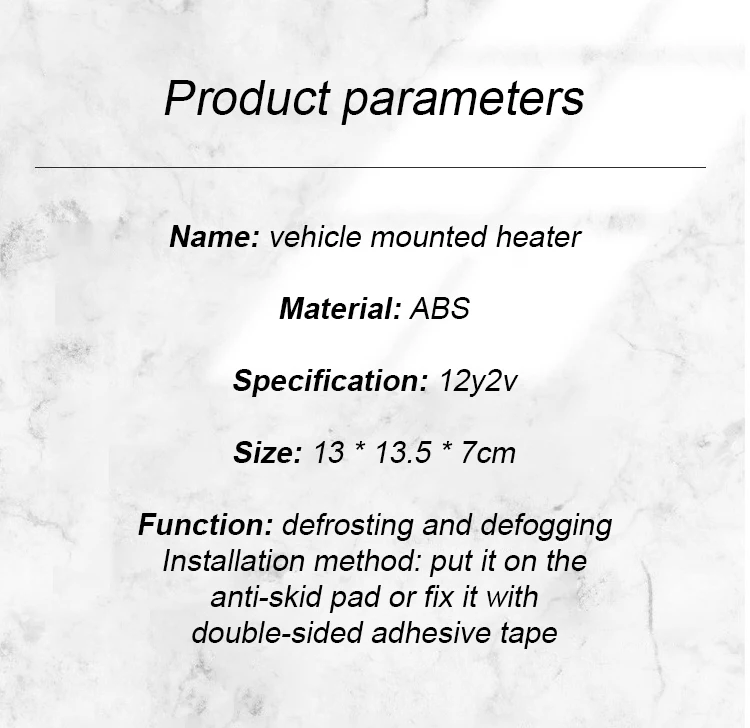 Небольшое теплое солнце зимой, размораживание и Размораживание нагревателя. Не нужно устанавливать, легко носить с собой, быстро нагревать, не легко лопнуть, а объем меньше. Размораживание и туман, зрение вождения более четкое и безопасное. Одна передача-это естественный ветер, а другая-теплый ветер. Универсальный шар, вращение на 360 градусов, использование под разными углами. Прикуриватель обеспечивает источник питания, который удобен и прост.