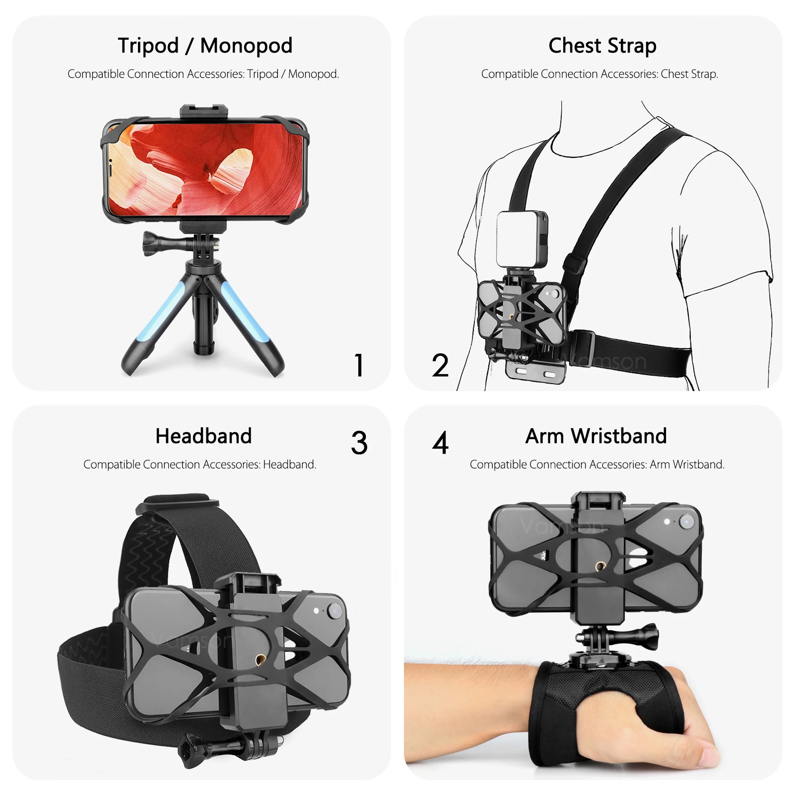 Например: штатив/монопод, повязка на голову, нагрудный ремень, ремешок на руку и т. Д.