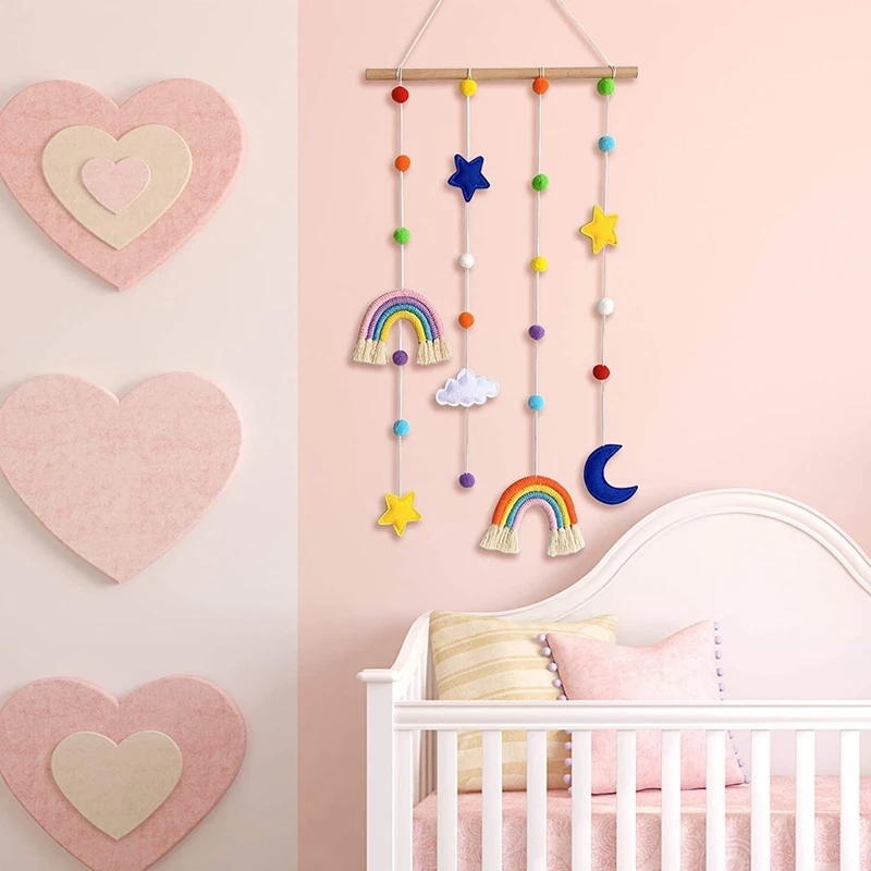 [Cute rainbow decoration] Rainbow decoration is very suitable for decoration to create a romantic and sweet atmosphere. Lovely cloud and star heart-shaped design, bright colors, multi-color tassels and pompom elements, bright and bright colors, easy to attract your attention, and make your home decoration more lovely and dreamy. Each tassel and the total length can be adjusted, you can slide the tassel farther or closer to the rope.