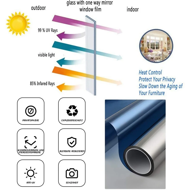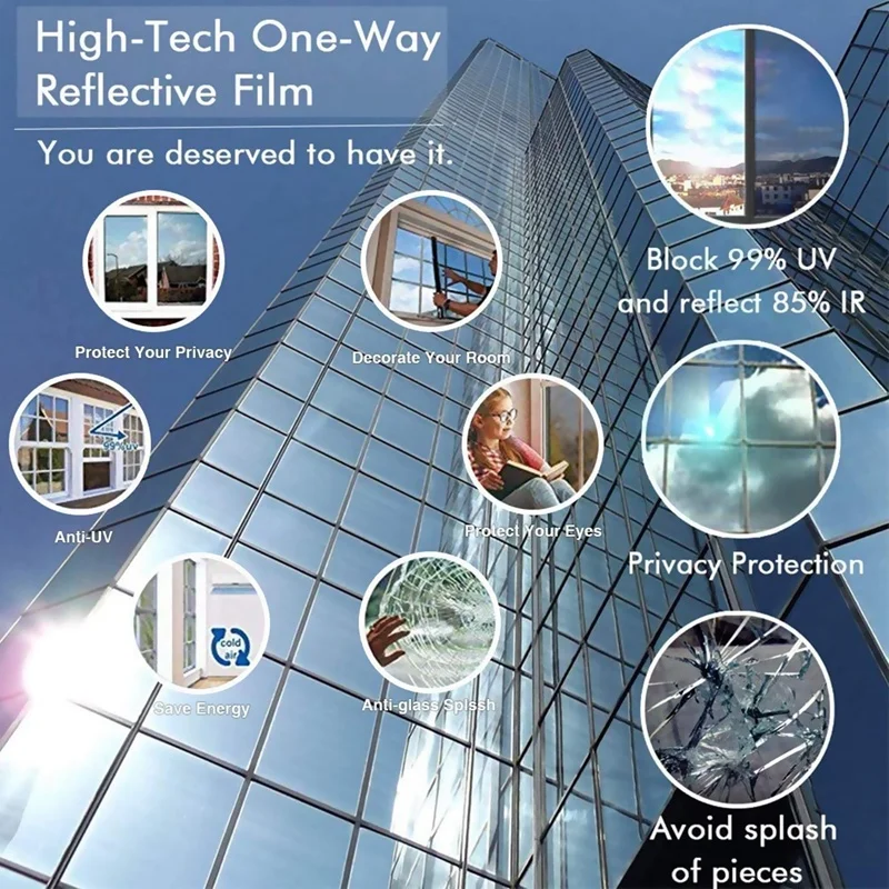 Анти-УФ теплоизоляция: Наша оконная зеркальная пленка также режет 90% тепла и 99% УФ. Отражая большую часть солнечного излучения, солнечная пленка обеспечивает комфортную температуру для ваших комнат
