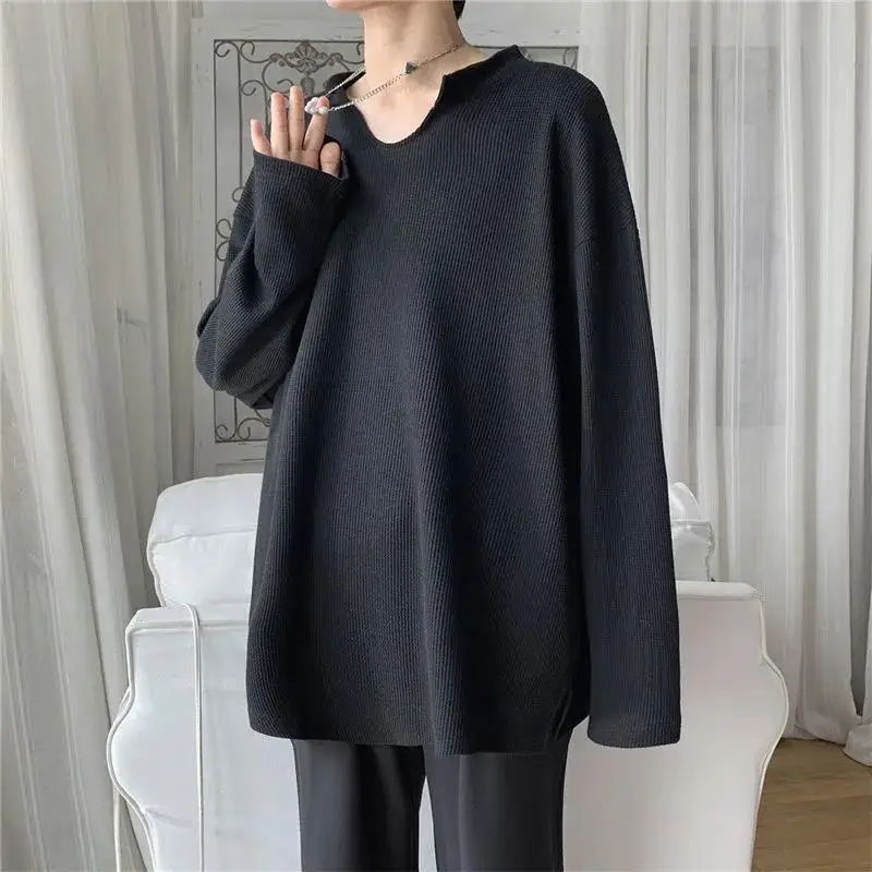 Повседневная негабаритная Корейская осенне-Весенняя Мужская футболка с v-образным вырезом и длинным рукавом, модная дышащая облегающая футболка Harajuku белого, черного, фиолетового цвета, новинка