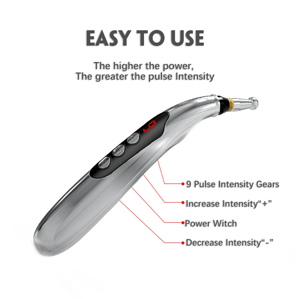 Энергетическая ручка меридиана эффективна для облегчения боли, вызванной артритом, ревматизмом, остеопорозом, радикулатом, мигренями, спортивными травмами и мышцами, болью в суставах и спине. Акупунктурная рука Легковесная и портативная для переноски, вы можете наслаждаться массажем тела в любом месте в любое время. Электронная иглоукалывающая ручка универсальна для всей семьи.