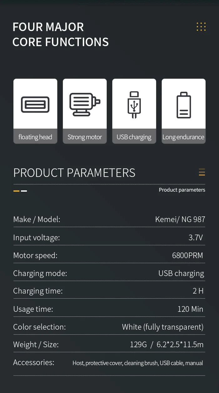 Аксессуары в комплекте: для вашего удобства KEMEI поставляется со всеми аксессуарами, требуемыми для использования. В комплект входит бритва, защита из фольги, usb-кабель, щетка для чистки и инструкция по эксплуатации