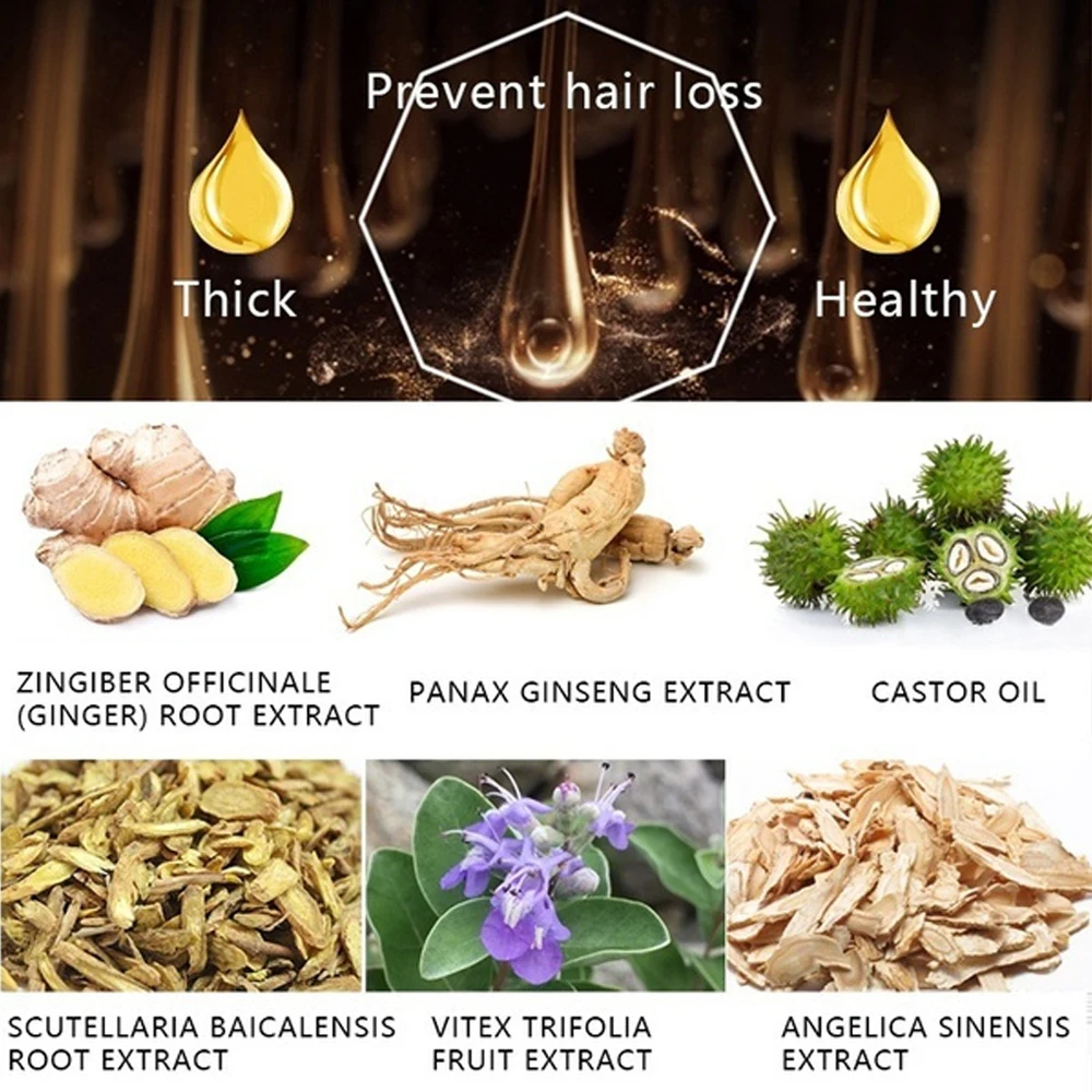 Натуральные Ингредиенты: масло для роста волос использует экстракты имбиря, корня цветка шерсти, Анжелика, никотинамид, токоферол (витамин е), Сальвия милтиоррхиза (salvia miltiorrhiza).