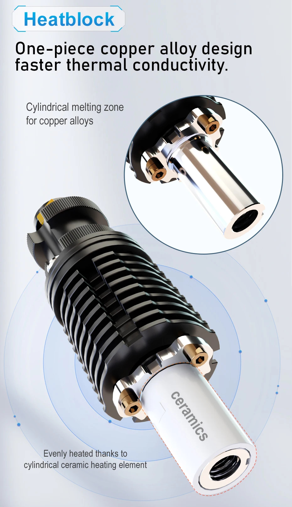 Rapido hotend имеет цилиндрическую зону плавления unque из медного сплава, обернутую в высокомощный керамический нагревательный элемент, так что он имеет более равномерную секцию нагрева и более короткий путь передачи тепла. Таким образом, можно повысить эффективность потока и нагрева.