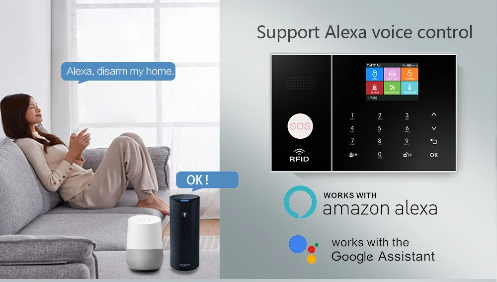 2. Новая система поддерживает Голосовое управление alexa. Совместимость с alexa, Google home, пожалуйста, посмотрите видео, вы можете видеть, что мы можем управлять хостом сигнализации с устройством alexa.