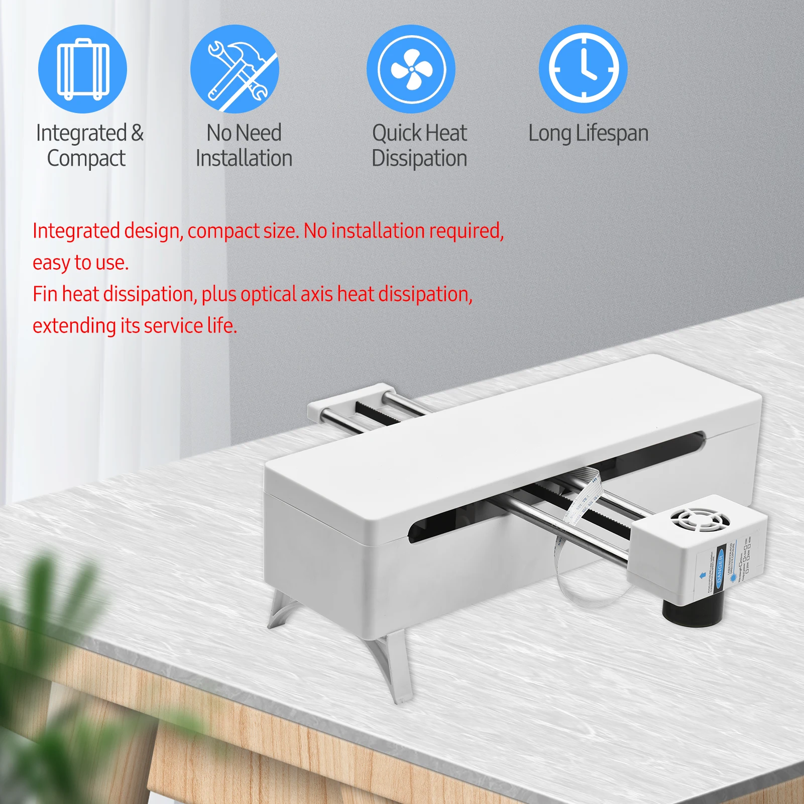Интегрированный дизайн, компактный размер. Установка не требуется, простота в использовании. Плавник рассеивания тепла, плюс оптическая ось рассеивания тепла, продлевая срок службы.