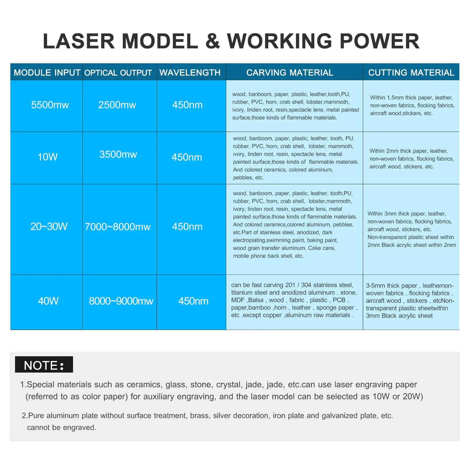 Сменный лазерный модуль дизайн, мы можем предоставить вам 5 виды выходную мощность для варианта (5,5 Вт/10 Вт/20 Вт/30 Вт/40 Вт). Различные лазерные модули для гравировки/резки различных видов материала и разной толщины.