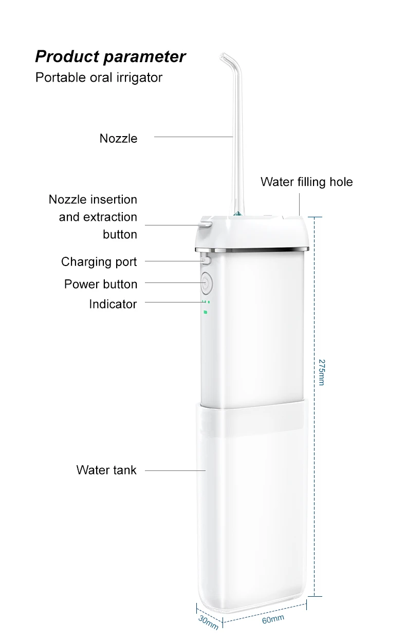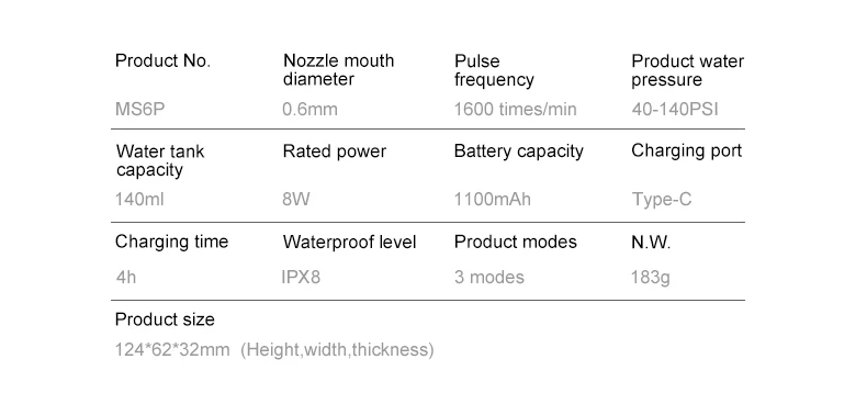 Мини портативный ирригатор для полости рта, водный ирригатор, зубной ирригатор, зубной очиститель, водный пульс, водяные зубы, USB<;br/> наша уникальность <;br/> Мини портативный ирригатор полости рта <;br/>IPX8 вся машина Водонепроницаемая <;br/> вращение на 360 ° насадка для промывки зубов 3 режима Регулировка удобно <;br/> портативный и необходимый для выхода <;br/>140 мл резервуар для воды <;br/> Международная сертификация <;br/>ROHS CE FC<;br/> выберите различные режимы очистки в различные периоды, удобно, Быстрый и здоровый <;br/> общий режим: для новых пользователей и зубов sensitve <;br/> импульсный режим: чередуйте сильный и мягкий режим <;br/> сильный режим: высокое давление воды, что обеспечивает глубокое очищение кожи <;br/> Три Насадки для зубной щетки для комплексной гигиены полости рта <;br/> Портативный & amp; Перезаряжаемые компактные размеры и светильник вес для путешествий зарядное устройство USB <;br/> удобная зарядка, перезаряжаемая где угодно <;br/> Внешний аккумулятор, TRAtEL srrLe, автомобильное зарядное устройство, Ноутбук <;br/> Интеллектуальная функция памяти запускается в режиме, который используется в прошлый раз <;br/>2 минуты автоматически выключается <;br/>60 дней выносливости при использовании один раз каждый день после полной зарядки <;br/> новый патент <;br/> Эластичный насос памяти <;br/> только половина размера сейчас, Защита окружающей среды и энергия, экономия меньше трения и более прочный, Нет утечки воды <;br/> как использовать?<;br/>1. Установите насадку <;br/>2. Откройте резервуар и ручку, чтобы заполнить воду <;br/> 3.поместите насадку в рот и нажмите кнопку питания, чтобы начать flossing<;br/>4. Нажмите кнопку включения питания, чтобы переключить режим <;br/>5. Хранение после использования. Снимите насадку, откройте ручку резервуара для воды и храните насадку <;br/>6. Регулярная очистка: отсоедините резервуар и очистите бак <;br/> характеристики продукта <;br/> номер продукта.:MS6P <;br/> Насадка Диаметр: 0,6 мм <;br/> частота импульсов: 1600 раз/мин <;br/> продукт давления воды: 40-140PSI <;br/> Емкость резервуара для воды: 140 мл <;br/> Номинальная мощность: 8 Вт <;br/> Емкость аккумулятора: 1100 мАч <;br/> Порт зарядки: тип C<;br/> Время зарядки: 4h<;br/> Уровень водонепроницаемости: IPX8<;br/> режимы продукта: 3 режима <;br/>N.W. : 183 г <; Бр/> размер изделия: 124*62*32 мм (ширина, толщина)<; Бр/> характеристики упаковки продукта <; Бр/> Стандартные аксессуары: ирригатор для полости рта X1, провода для зарядки X1, Инструкция (сертификат квалификации X1, гарантийный талон, в комплекте) X1,<;br/> стандартное сопло X2, Ортодонтическое сопло X1, сопло для покрытия языка X1,<;br/> Спасибо за вашу любовь, мы быстро доставим товар после заказа, Вы можете связаться с нами в любое время, если у вас есть какие-либо вопросы, хорошее время доставки