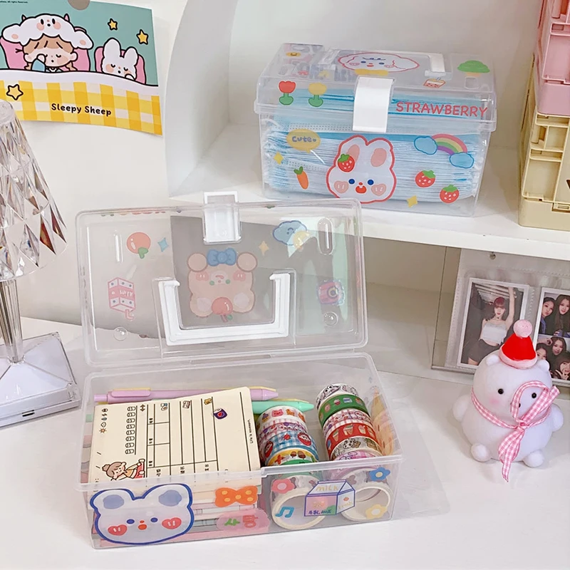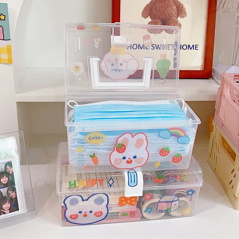 Kawaii портативная коробка для хранения с наклейкой с ручкой с крышкой милые прозрачные пластиковые контейнеры для косметическая маска канцелярский стол органайзер