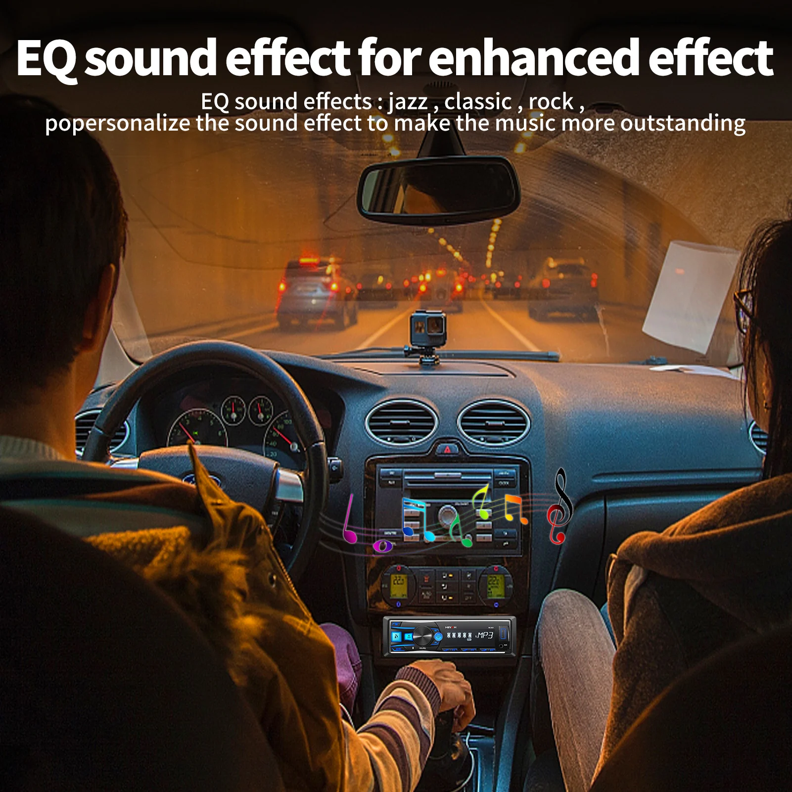 Воспроизведение MP3 поддерживает пауза/предварительный просмотр/повтор/случайное воспроизведение и выбор вверх/вниз 10 треков; Электронный басовый/тройной/левый и правый баланс/контроль громкости переднего и заднего баланса; 1переднее отверстие для аудиовхода AUX и задний разъем L/R аудио RCA выходное отверстие; 4-канальный выход высокой мощности (4 колонки высокой мощности) Двойная зарядка USB, Опциональная функция приложения, высококачественная большая материнская плата. Перезаряжаемый USB, Встроенный микрофон Bt +, поддержка громкой связи и расширенный режим передачи звука, поддержка индикации часов во время выключения питания.