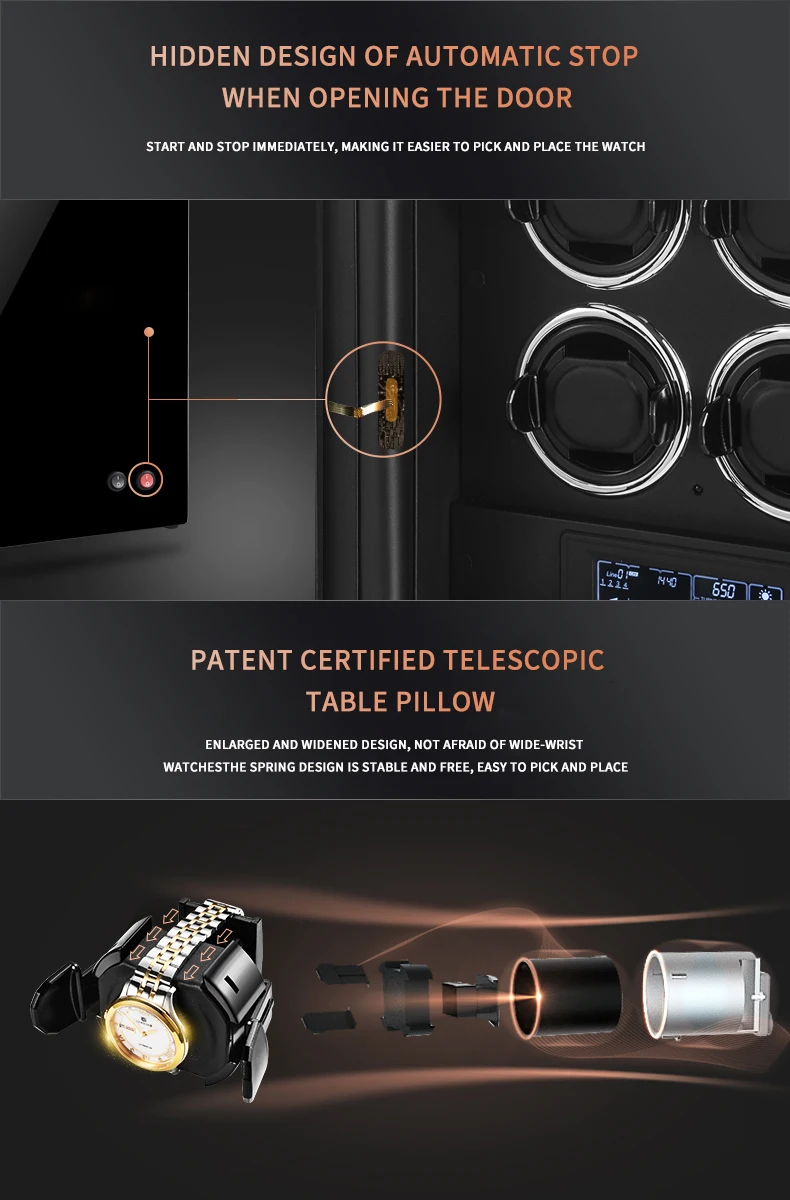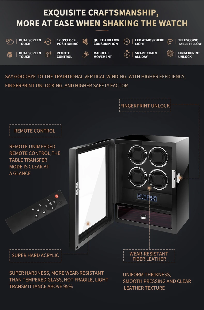 Особенности:Датчик крышки + сенсорный экран и светодиодный светильник + пульт дистанционного управления + держатель для часов с возможностью вставки на 360 градусов +Блокировка отпечатков пальцев