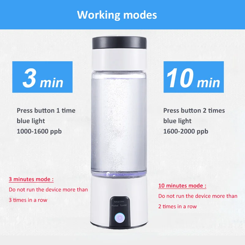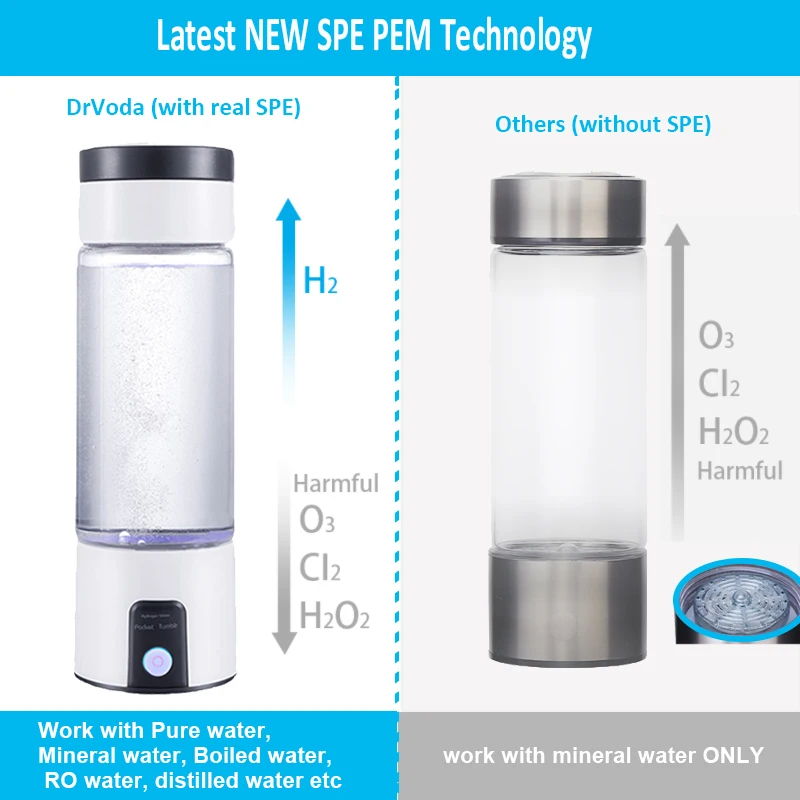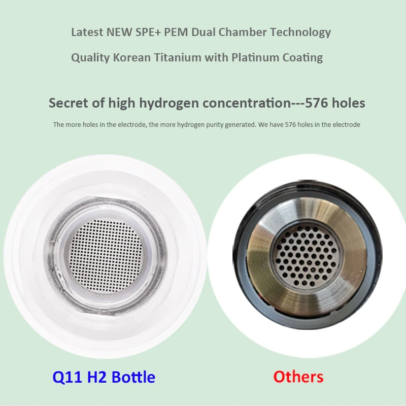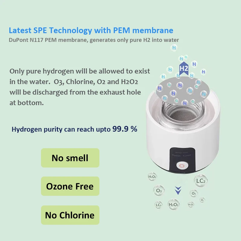 Наша бутылка для воды, богатая водородом, использует технологию SPE (твердый поли электролитический), а пластина электролиза имеет мембрану PEM (протонная мембрана), поэтому они производят чистую и безопасную воду, богатую водородом, без побочных продуктов, таких как озон (O3), хлор (cl) и другие оксиды.