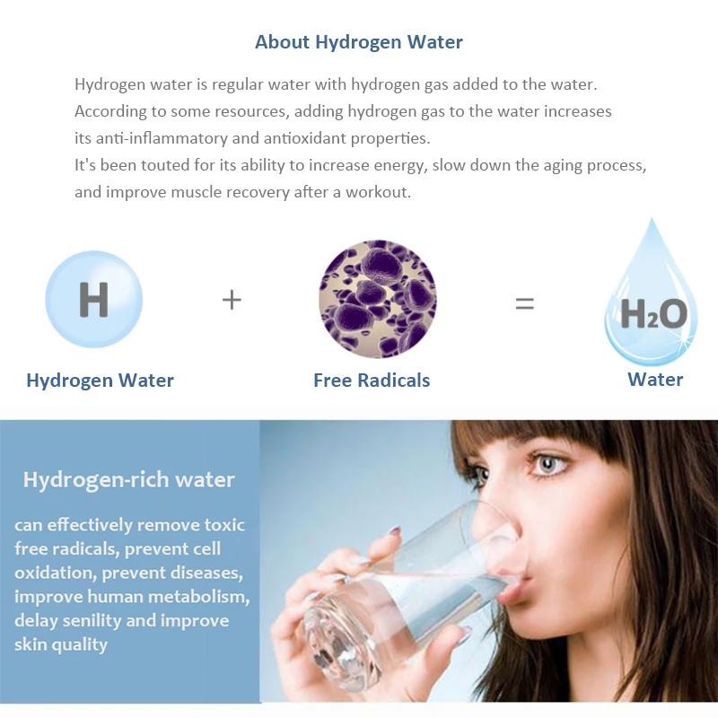 Богатая водородом вода, также известная как «водородная молекулярная вода», называется «Suiso вода» в Японии и относится к воде, богатой водородом. По данным Японии, исследовательский Отчет профессора Тай Тин подтверждает, что водород сам по себе является оптимальным антиоксидантом. Богатые водородом наборы высокого водорода, отрицательного потенциала, слабых щелочных и небольших молекул в целом. Молекулы водорода в воде действуют как мощные антиоксиданты. Вода, богатая водородом, легко поступает в клеточный канал, способствует метаболизму, устраняет злокачественные реактивные безкислородные радикалы, способствует детоксикации клеток, повышает гидратацию клеток и повышает иммунитет организма.