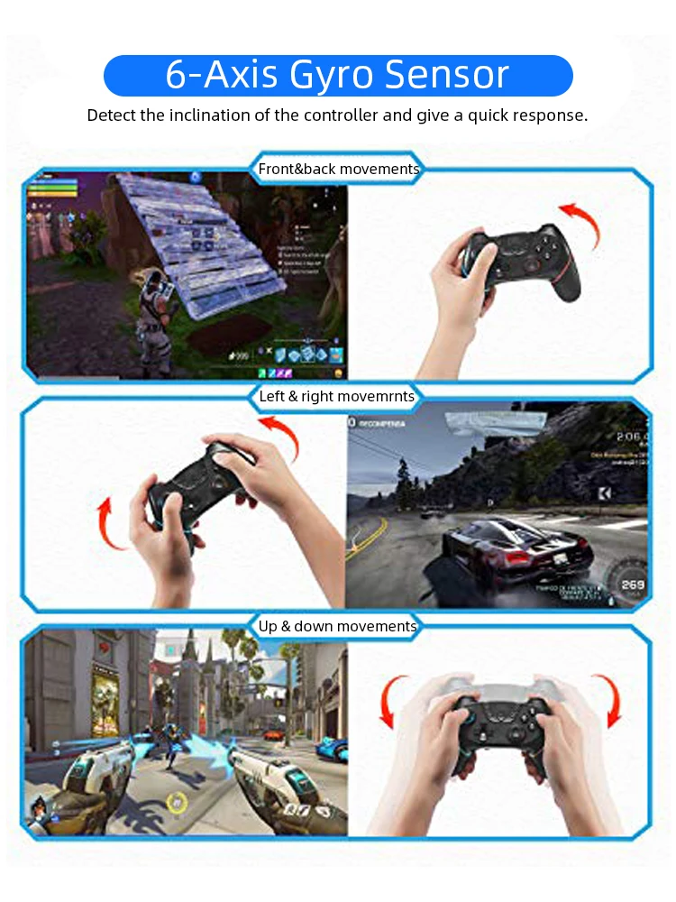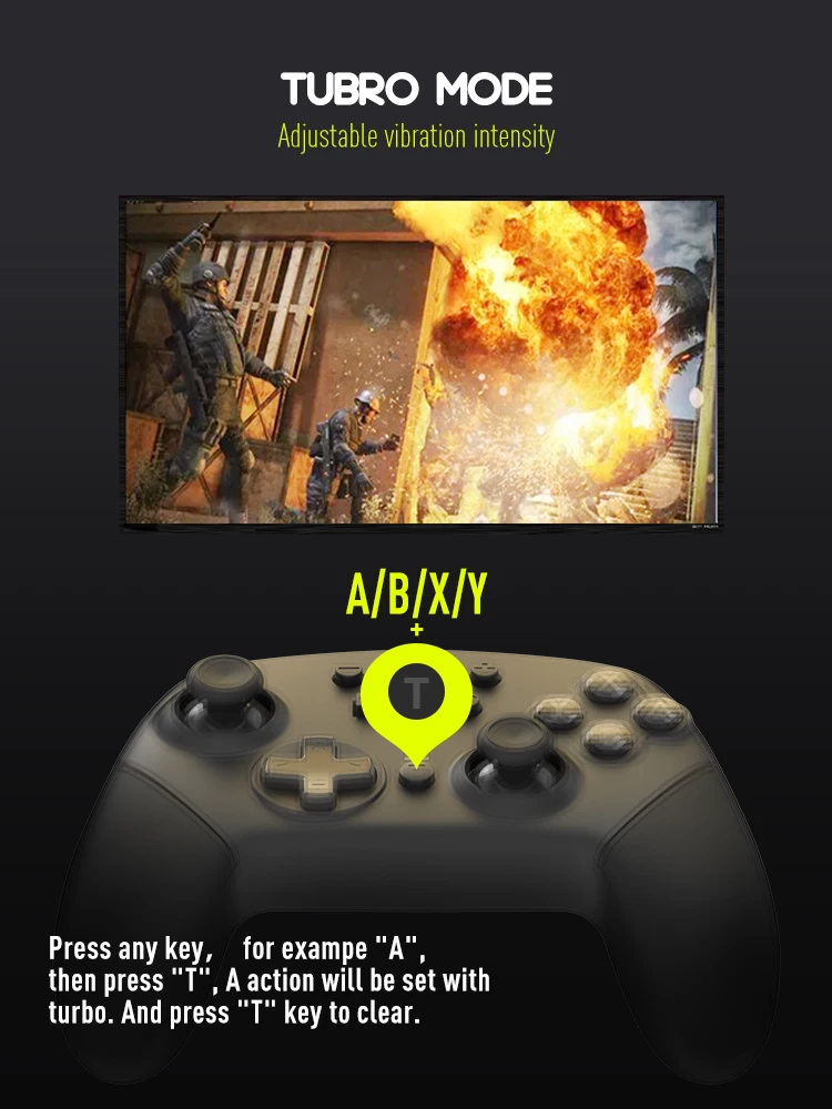 Этот контроллер переключателя поддерживает гироскопическую ось, двойные Вибромоторы, двойные аналоговые джойстики и функцию Turbo. С регулируемой 3 уровнями скорости турбо (5 съемок/с, 12 съемок/с, 20 съемок/с) и функцией автоматического огня, супер Чувствительная Сенсорная Кнопка обеспечивает точный игровой опыт, функция Turbo облегчает игру в Аркады или экшен-игры.