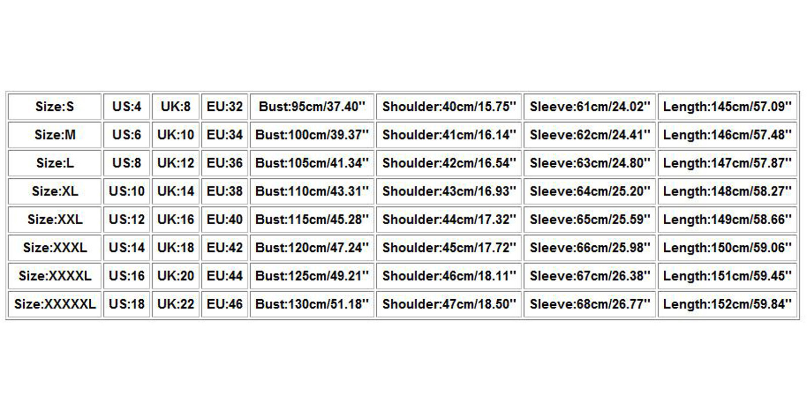 Размеры США Великобритания ЕС Бюст Плечо Рукав Длина XL 10 14 38 110 см/43,31'' 43 см/16,93'' 64 см/25,20'' 148 см/58,27'' XХХL 14 18 40 120 см/47,24'' 45 см/17,72'' 66 см/25,98'' 150 см/59,06'' XXXXL 16 20 42 125 см/49,21'' 46 см/18,11'' 67 см/26,38'' 151 см/59,45'' XXXXXL 18 22 44 130 см/51,18'' 47 см/18,50'' 68 см/26,77'' 152 см/59,84''