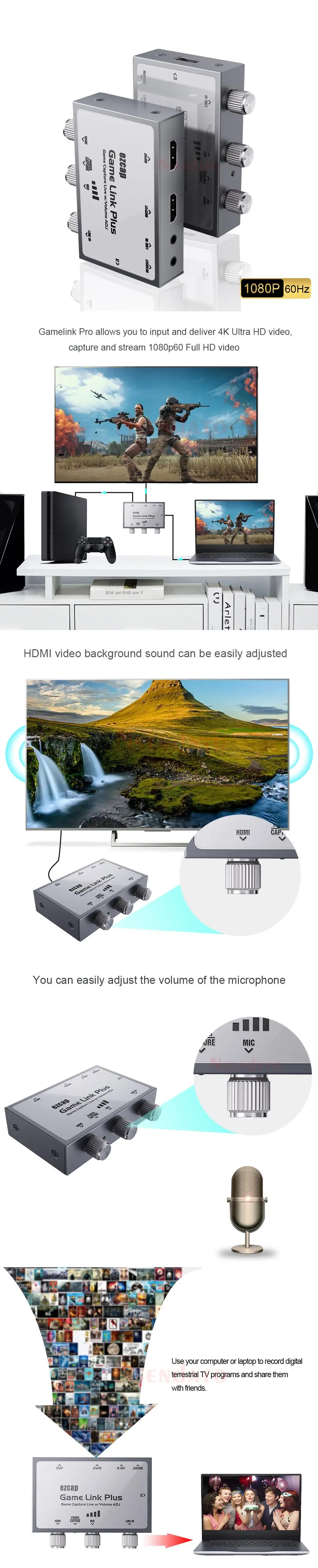 ezcap312 Game Link Pro is a new generation of high-quality and inexpensive computer video live broadcast artifact.It supports 4K60 HDMI video input and bypass output, its highest capture resoution is 1080p 60fps mjpeg.with USB 2.0 Port, regular computer can be adapted. Equipped with CTIA standard headset interface and3.5mm line input interface to meet general audio input and output. The most special design of the volume adjustmentknob, there is no need to rush to adjust the software volume or the device source volume during live broadcast. You can achieve the goal by intuitively adjusting the corresponding volume knob of ezcap312 Game Link Pro.