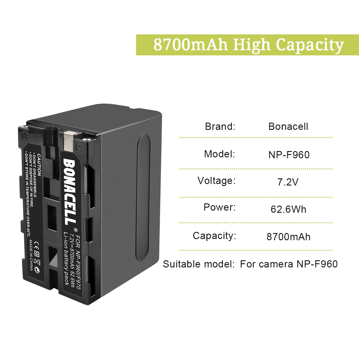 Эта запасная батарея предназначена для камеры Sony NP-F960, это своего рода литий-ионная перезаряжаемая батарея, вы можете носить ее в любом месте в любое время, очень удобно в использовании. И не имеет эффекта памяти. Может быть заряжен или разряжен по мере необходимости без потери мощности. Функции такие же, как у OEM батареи.
