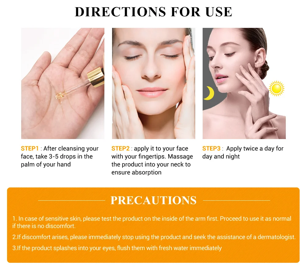 Содержит высокую активность мелкомолекулы витамина С, с антиоксидантной защитой, этот продукт может предотвратить образование меланина. Также с такими функциями, как отбеливание и осветление тона кожи, удаление пятен и меланина, он может восстановить здоровье кожи, способствовать метаболизму кожи и активировать поврежденные клетки кожи, чтобы восстановить эластичность.