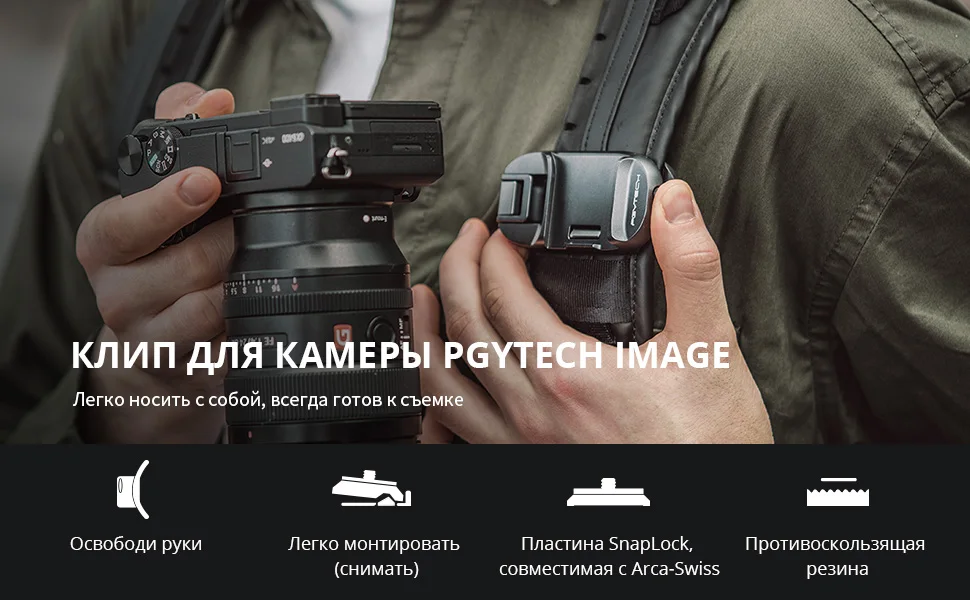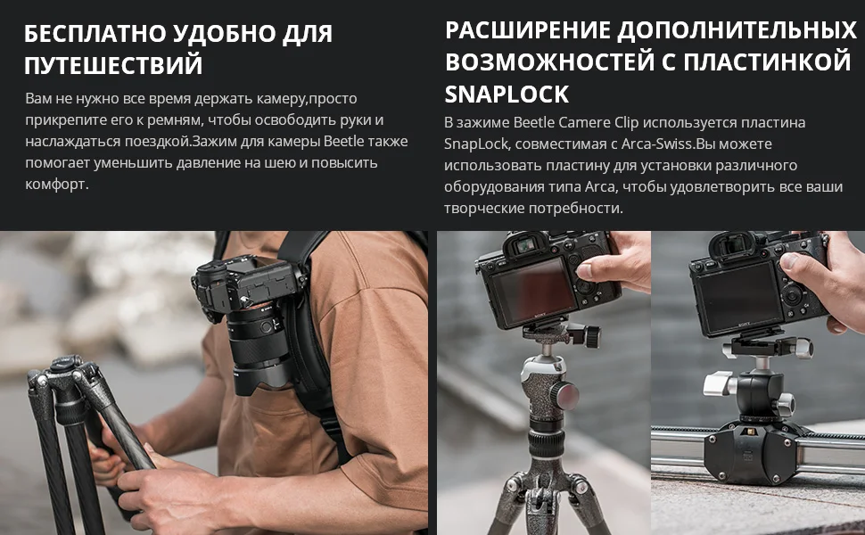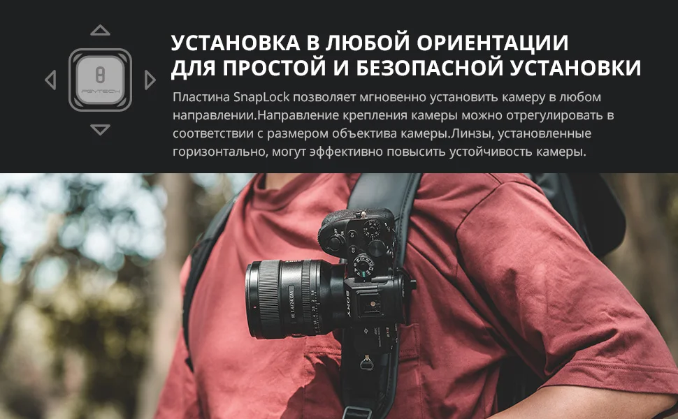Пластина SnapLock позволяет мгновенно установить камеру в любом направлении. Направление крепления камеры можно регулировать в соответствии с размером объектива камеры. Линзы, установленные горизонтально, могут эффективно повысить стабильность камеры.