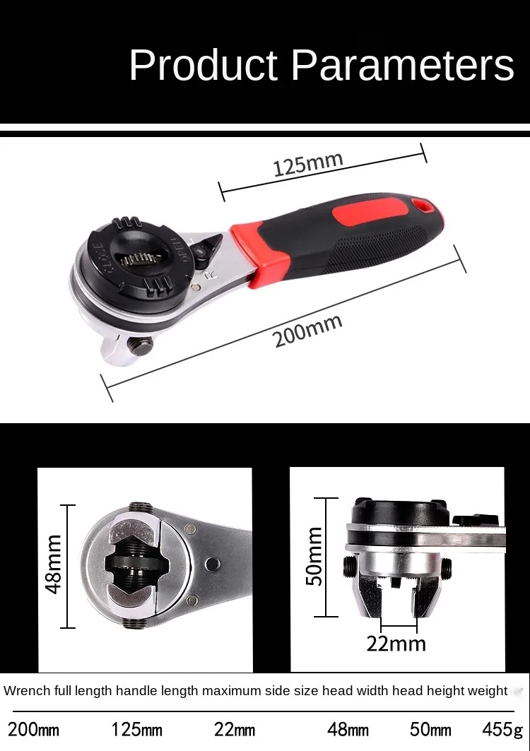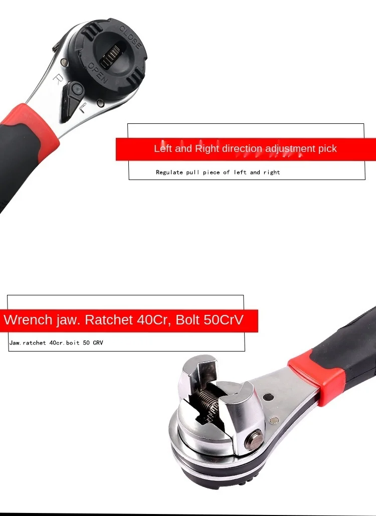 Яркое хромированное покрытие на поверхности, красная и черная ручка, размер с обратной стороны 6,35-22,2 мм, челюсть, корешок колеса 40Cr, болт 50CrV, применимый к метрическим 6-22, или Британский 1 / 4-7 / 8, винты, шестерни и т. д