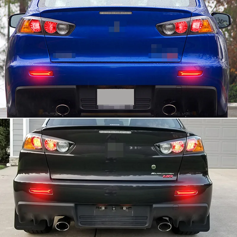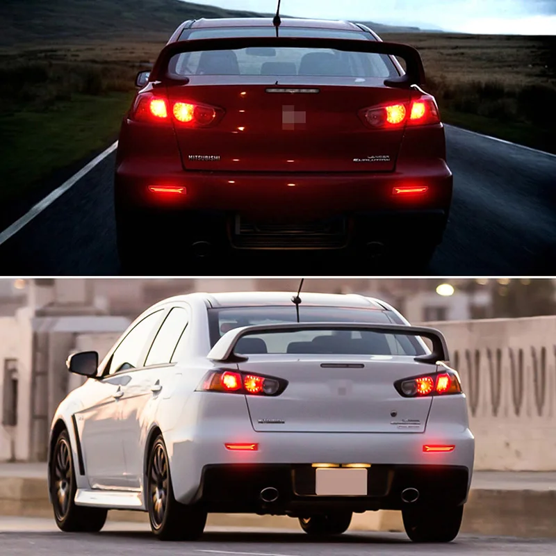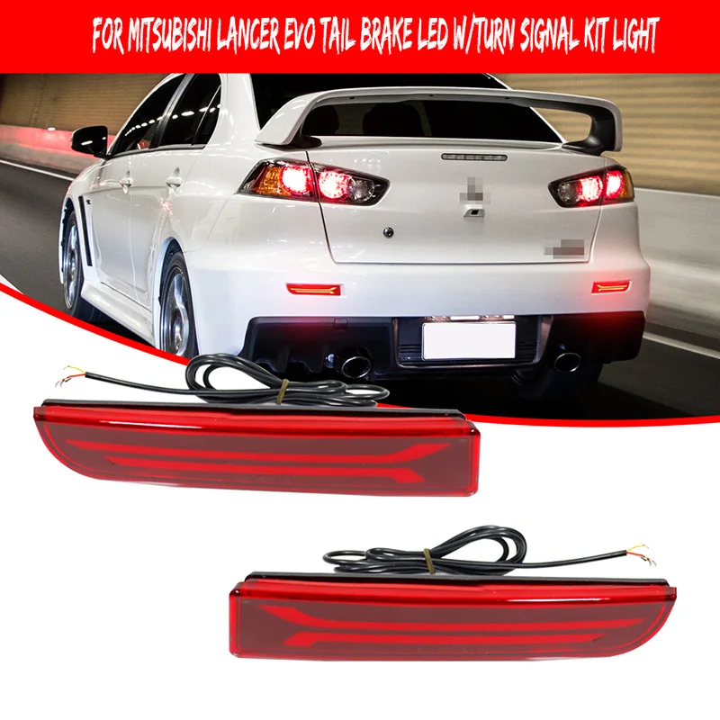This page features a set of brand new red / smoked lens LED rear bumper reflector brake tail lights w/ stroboflash turn signal lights, rear fog lighting kit For 2008-2017 Mitsubishi Lancer; 2008-2017 Mitsubishi Evolution X & 2011-2012 Mitsubishi Outlander