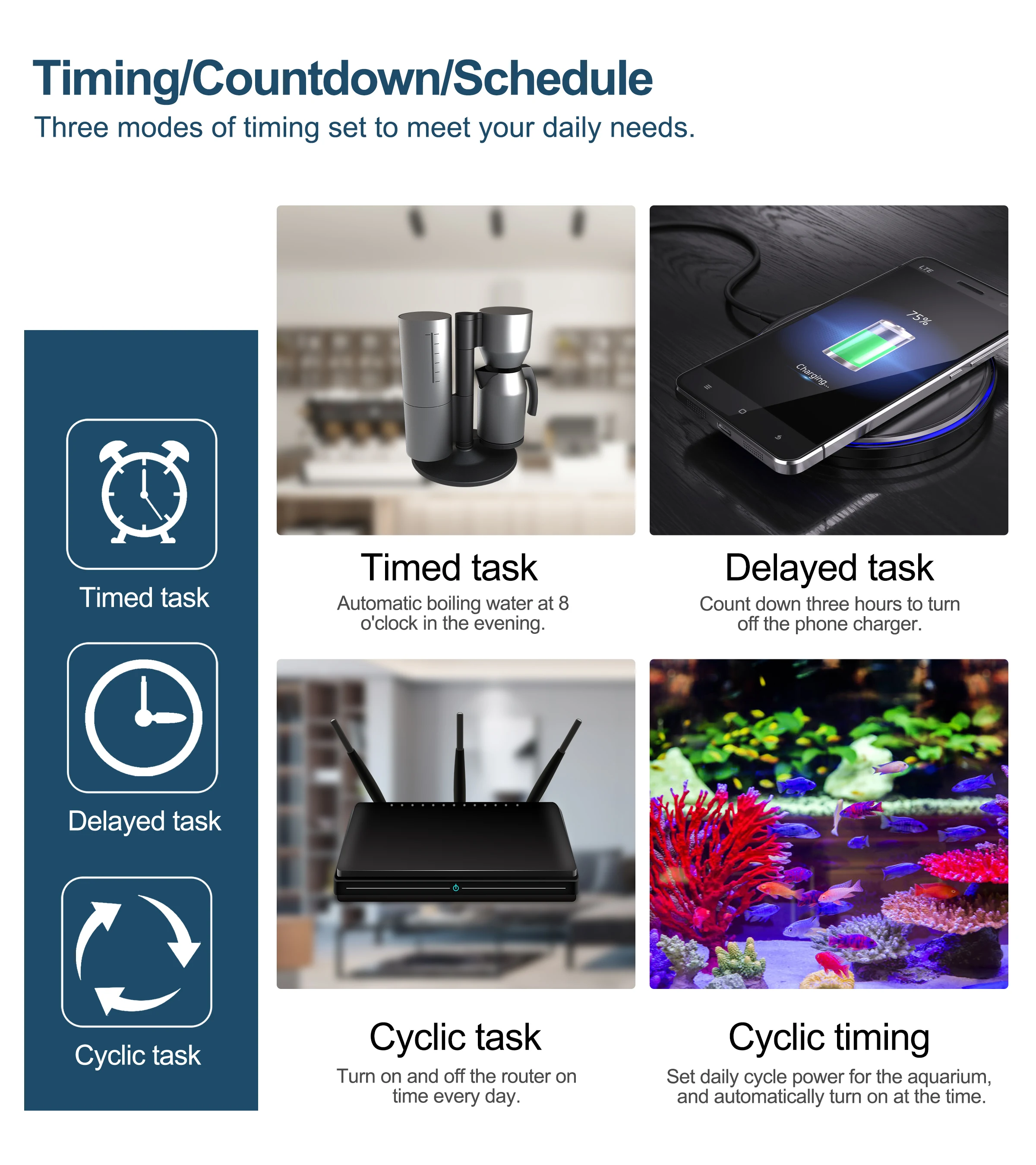 Таймер может быть легко установлен в соответствии с вашими потребностями. Это более удобно для вас, чтобы настроить расписание для автоматического запуска вилки. Наслаждайтесь трудосберегающей умной жизнью без повторения включения и выключения в приложении или ручного управления.