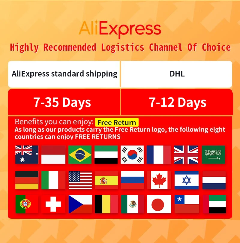 Выберите AliExpress стандартную логистику, следующие 24 страны/регионы могут получить безусловное возмещение.