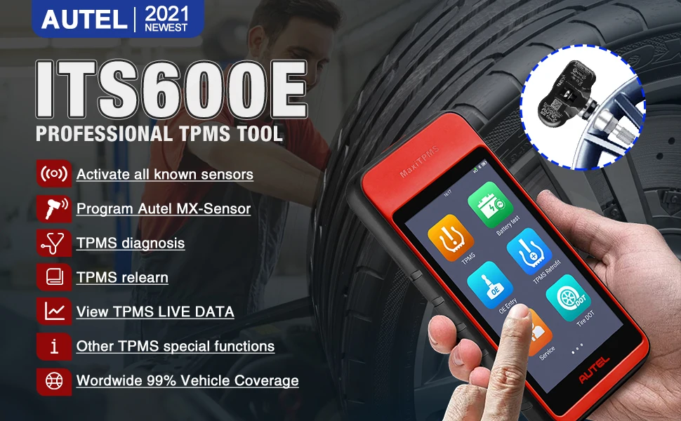 ITS600 может активировать, читать и переосваивать все известные датчики, выполнять диагностику системы TPMS и четыре общих обслуживания. Кроме того, он обеспечивает сканирование номера точки, уведомление об истечении срока службы шин и доступ для поиска напоминания.