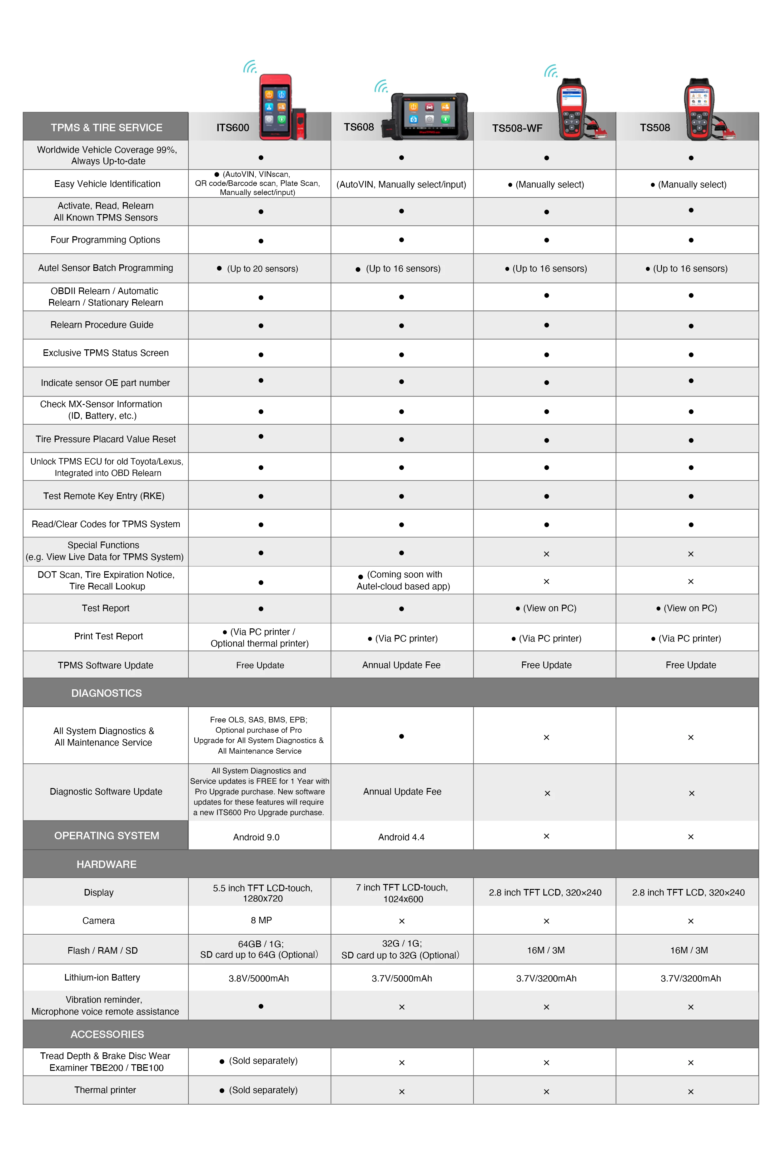 Совместимость с американскими, азиатскими и европейскими TPMS-оборудованными транспортными средствами, ITS600 имеет улучшенный экран состояния TPMS, VINscan для быстрой идентификации транспортного средства, четыре варианта программирования mx-датчика, функция OBDII relearn и инструкции на экране для всех транспортных средств.