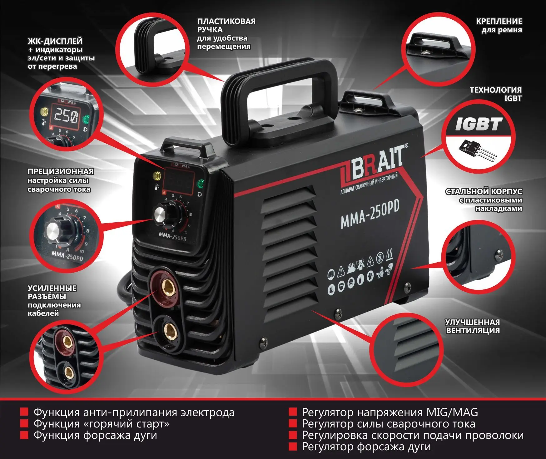 Mma-250pd Brait предназначен для работы с штучными электродами (MMA). Отличный вариант для ремонтной команды, для работы на строительстве или производстве. Плавная регулировка сварочного тока удобно отображается на цифровом дисплее. Устройство имеет Автоматические настройки горячего запуска и форсированных arc-современных функций, чтобы сделать работу начинающих проще, а результат профессиональной работы-отличное качество. Компактный размер и легкий вес, будут сделаны при использовании устройства в труднодоступных местах и на высотных сооружениях.