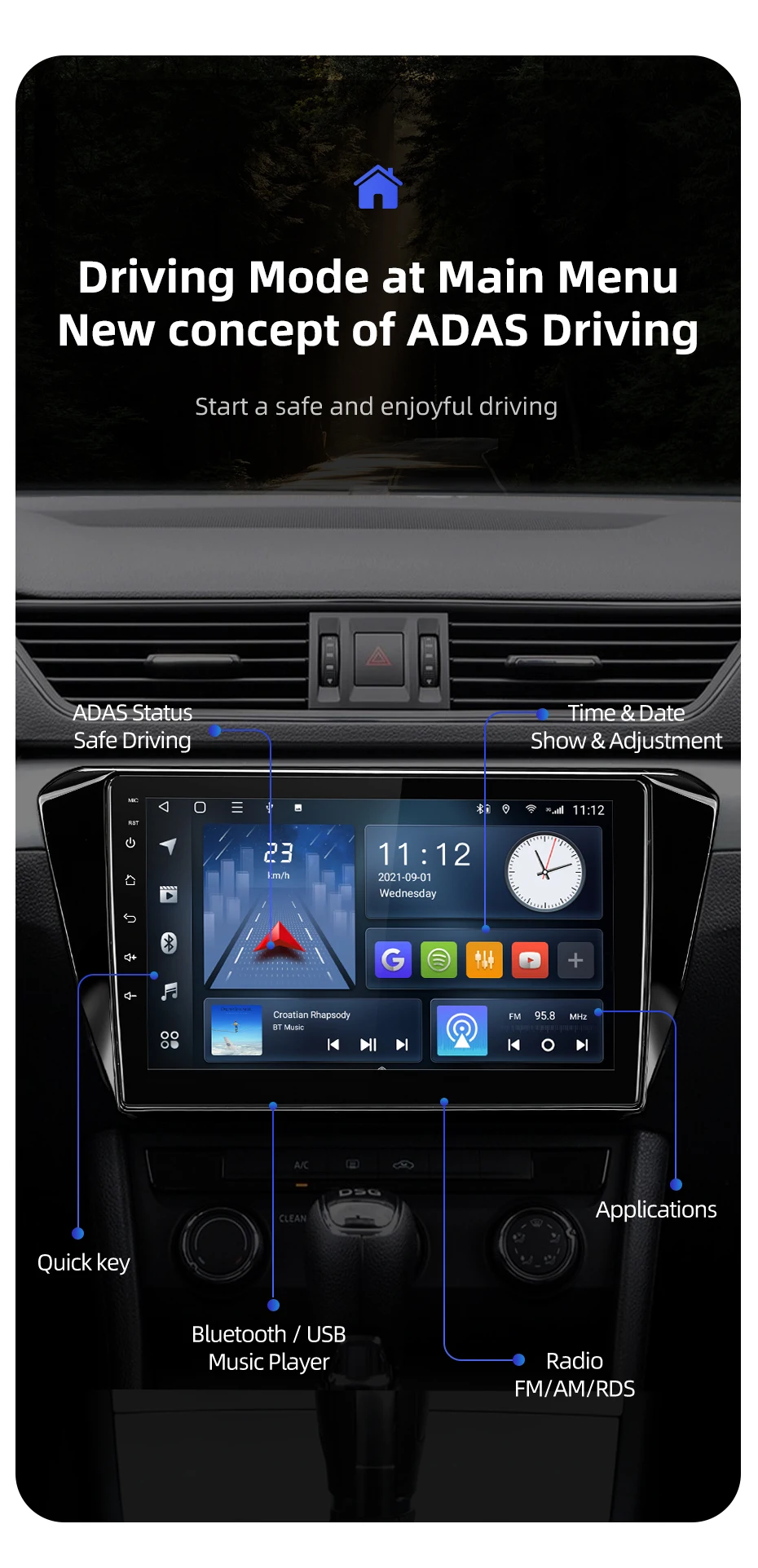 Система ADAS поддерживает предупреждение заднего конца и предупреждение о выходе из полосы движения. Больше безопасности с системой ADAS. (Видеорегистратор не входит в комплект)