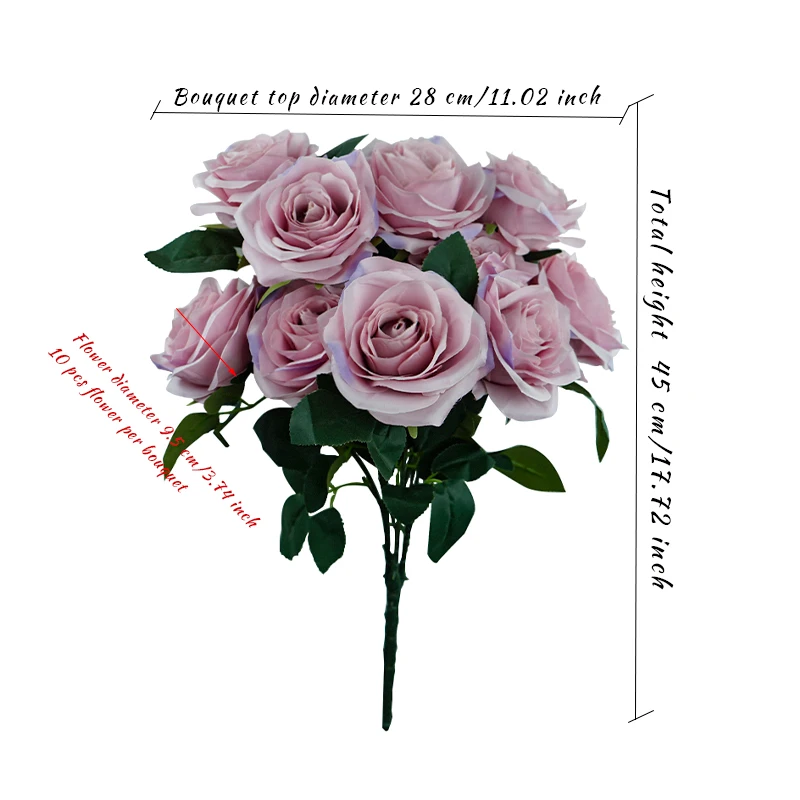 Измерение/Размер (прибл.):Букет Общая высота: 45 см/17,72 дюймов, безопасность открытиея ширина: 28 см/11,02 дюйма, диаметр цветка: 9,5 см/3,74 дюймов; 10 цветов в букет