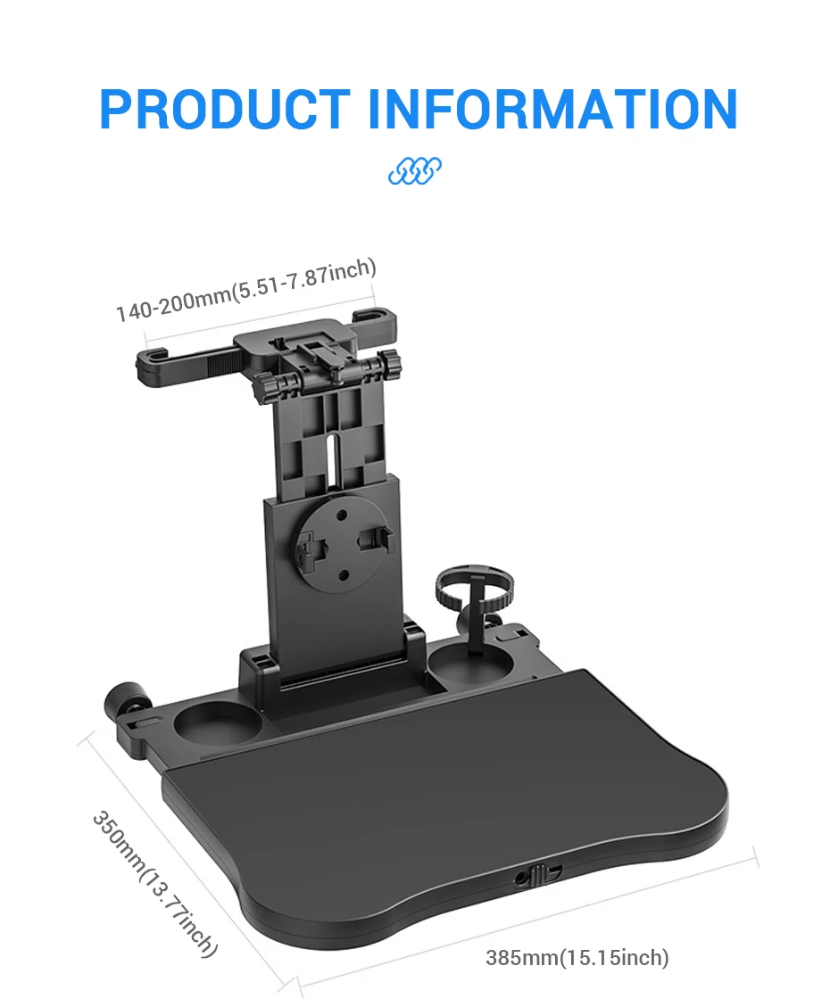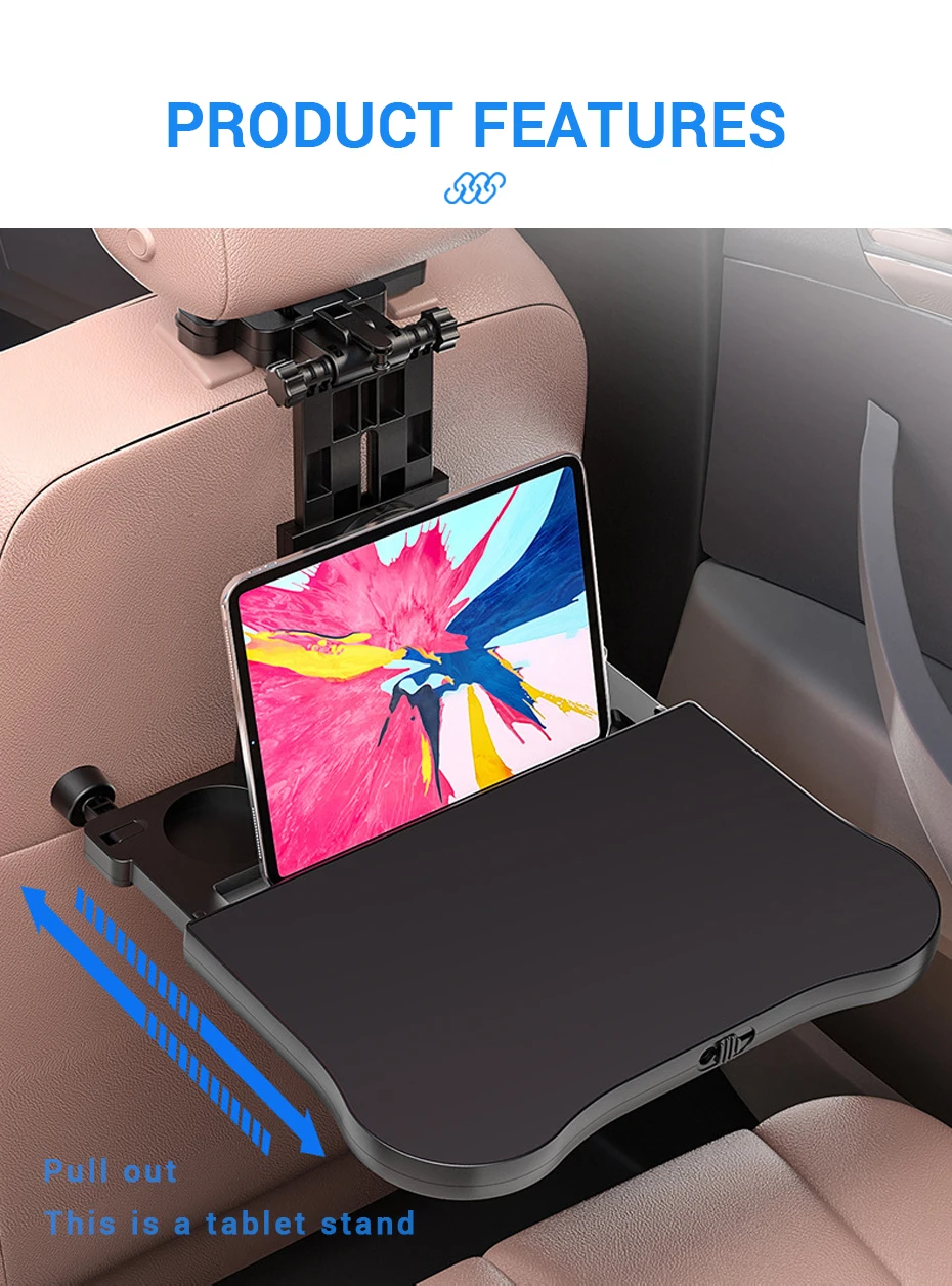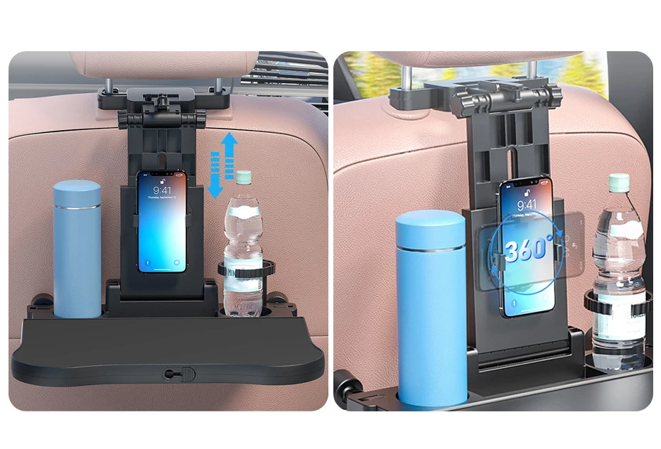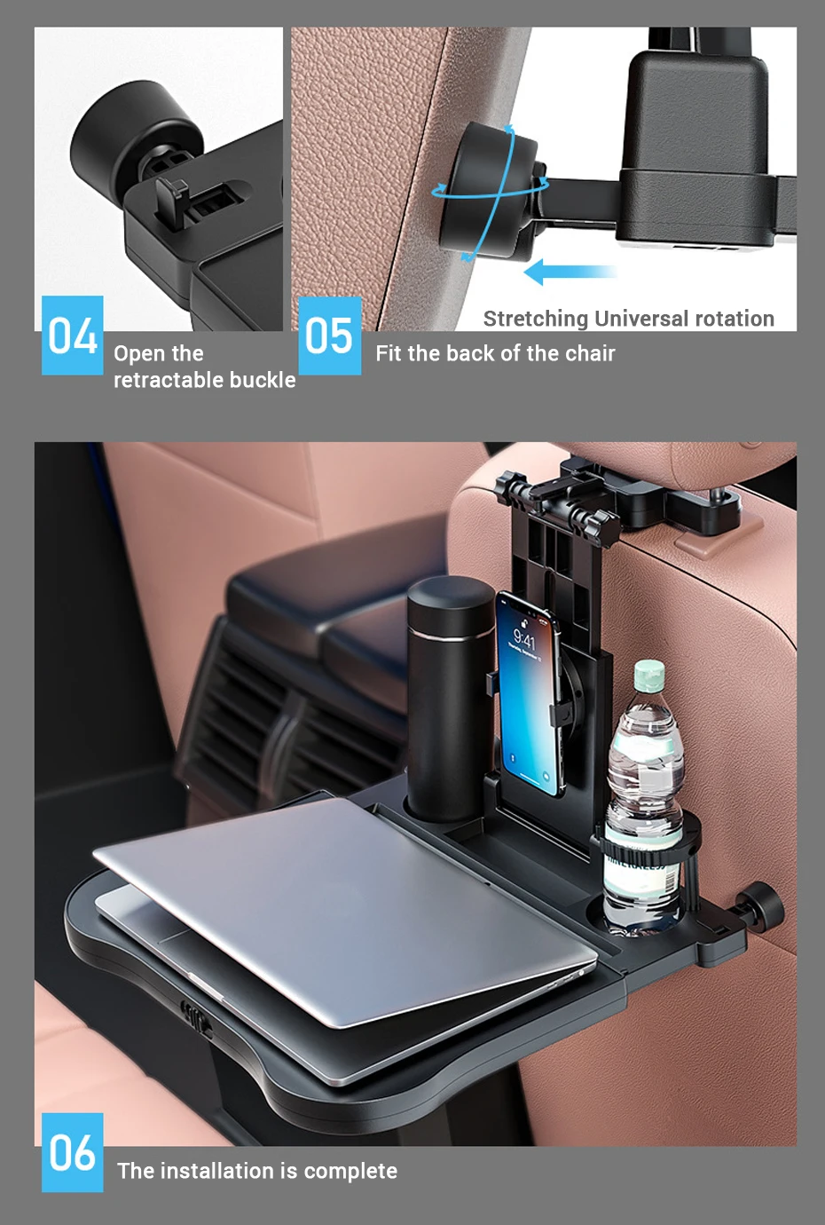 🚗【How to adjust the table】:①The table can be pulled off the buckle and fixed on the headrest; ②The table has slide rails that can slide down, and the fulcrum is raised to support the seat; ③The mobile phone can be placed in the mobile phone holder, which can be adjusted horizontally and vertically; ④The table has two cups Hold the cup; ⑤ Pull out the table, you can put laptops, tablets, books, food, etc.