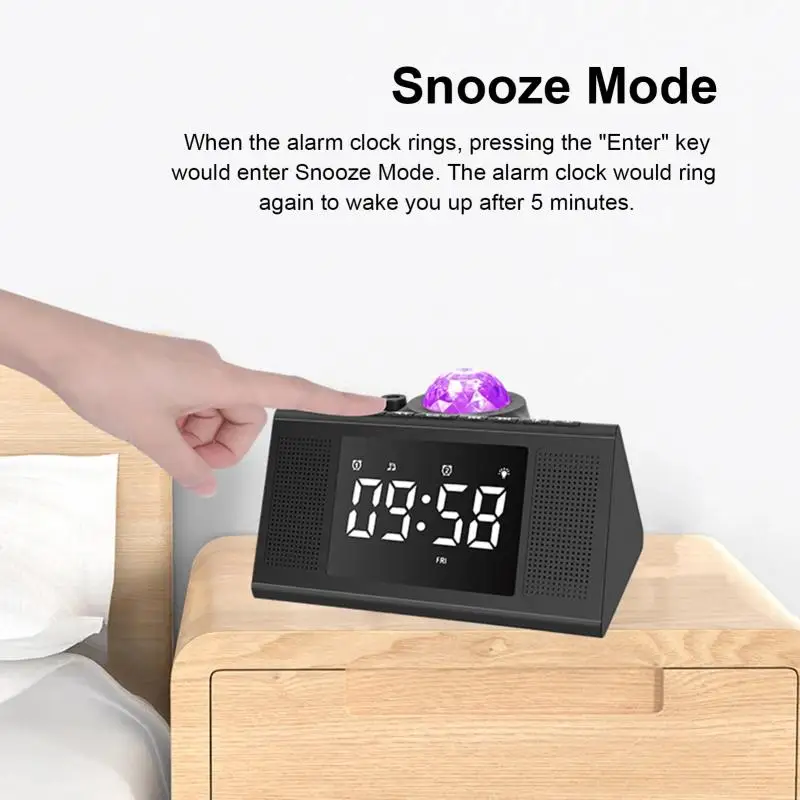 3. Можно установить два набора будильника, режим трех недель: с понедельника по пятницу, с понедельника по воскресенье, с субботы по воскресенье; Можно выбрать три вида будильника: музыка, радио, проекционный светильник + музыка.