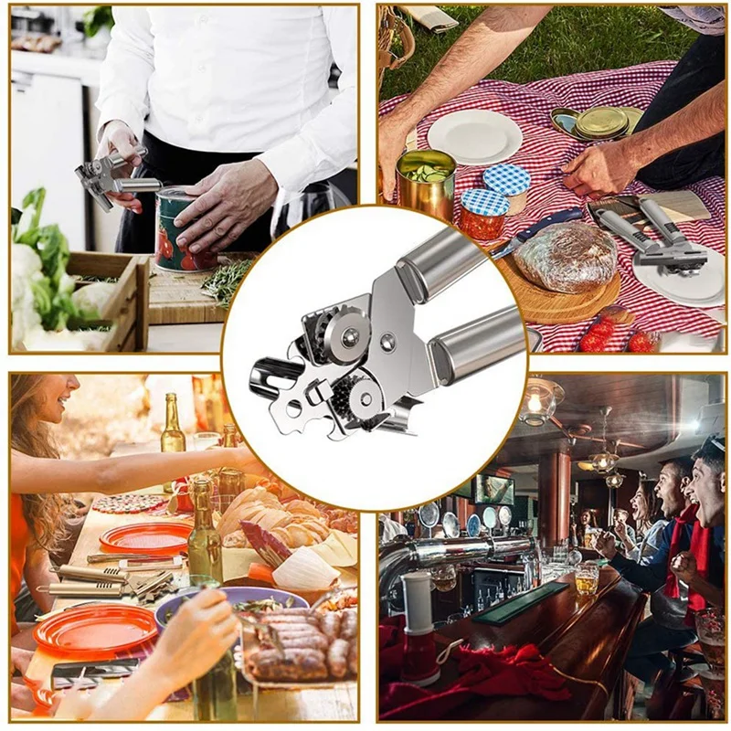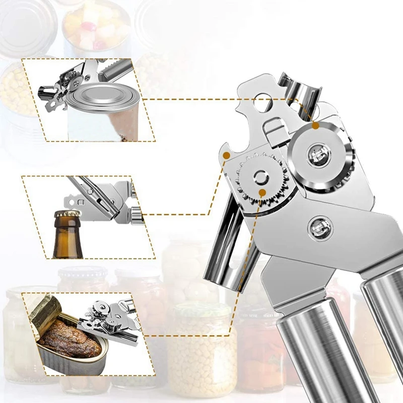[Премиум качество 3-в-1 Универсальный консервный нож] изготовлен из высокого качества пищевой нержавеющей стали, консервный нож + открывалка для бутылок + открывашка. Он сочетает в себе 3 функции в одном блоке. Этот универсальный консервный нож предназначен для открытия крышки банки, открытия крышки бутылки, парения или ослабления крышки банки.