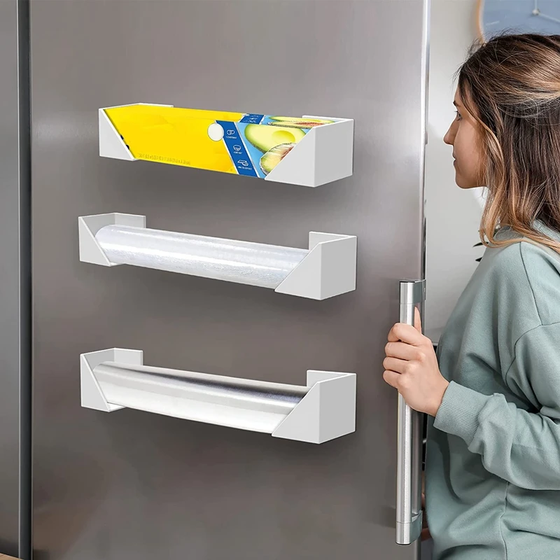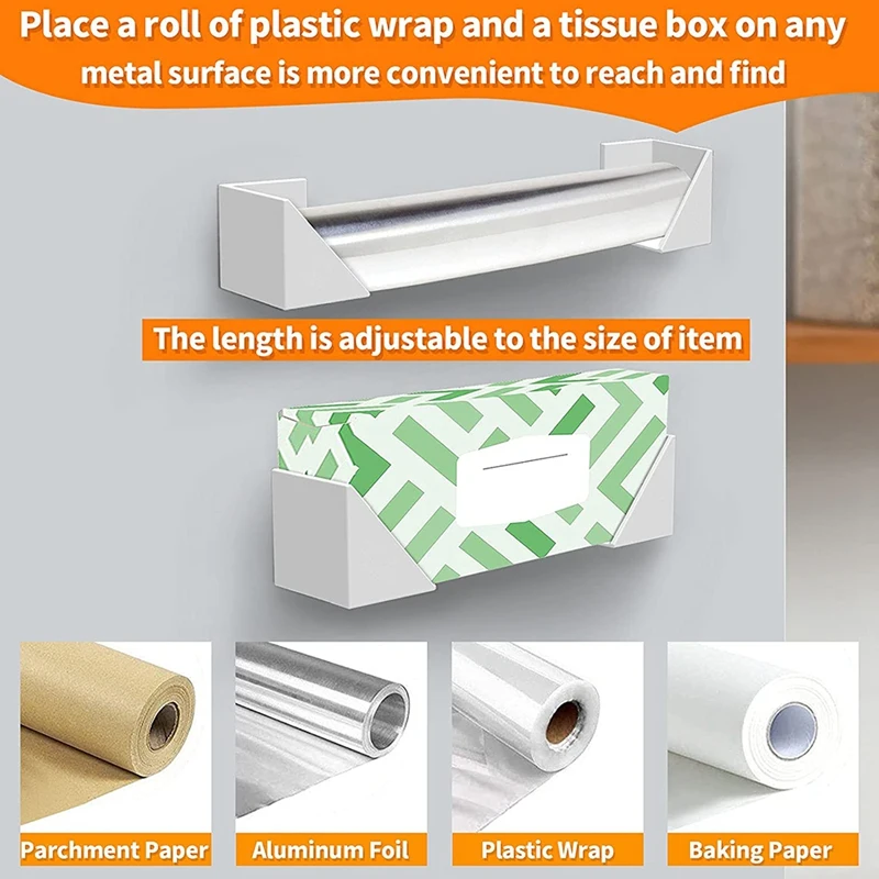 Регулируемое кухонное хранилище: магнитный органайзер для холодильника изготовлен из высококачественного сильного магнита. Этот органайзер упаковочной коробки может вместить вес 4 фунта, подходит для рулонов пластиковой упаковки, алюминиевой фольги, пергаментной бумаги, папиросной бумаги, восковой бумаги, пергаментной бумаги, оберточной бумаги и т. д. Организация и хранение шкафа долговечны, используются технологии окисления и сопротивления.