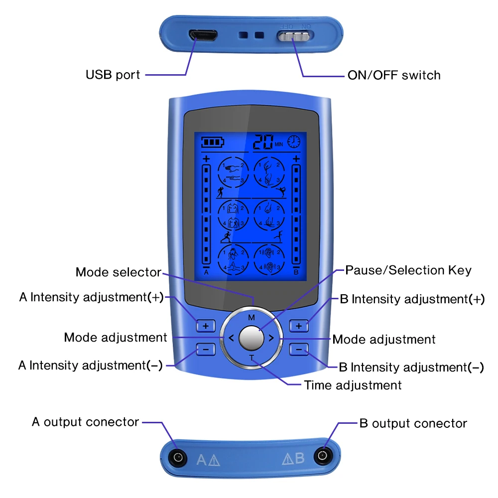 4. Поддержка двойных независимых выходов (A, B канал), чтобы позволить кастомизации приложений на различных областях тела с различной интенсивностью массажа одновременно, практично поделиться с друзьями или семьей вместе.