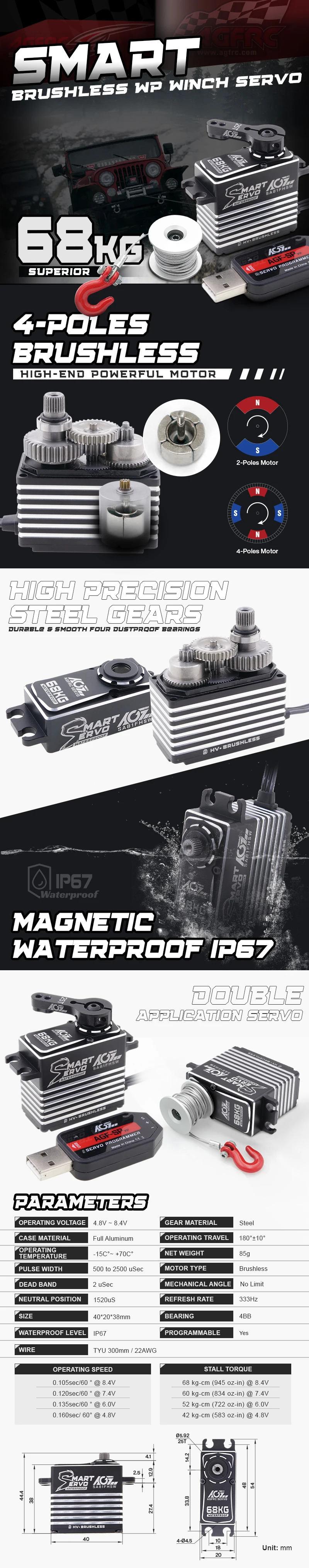 Полностью обновления от дизайна и материала для всей сервопривода, невероятно закаленная нержавеющая сталь зубчатые колеса и штифт, superb, надежная защита от пыли и надежный четыре шарикоподшипники, возможностью напряжения тока и монстр мощности 4-х полюсной бесщеточным Мотором, который доставляет гораздо более высокий крутящий момент с высотой всего 38 мм. Высокоточный Магнитный кодировщик, который позволяет сервоприводу работать во влажной или дождливой среде. Кроме того, он также продолжает программируемую функцию, которая позволяет регулировать параметр сервопривода и менять режим сервопривода с помощью USB программатора для различных приложений-рулевого управления/дроссельной заслонки или лебедки.