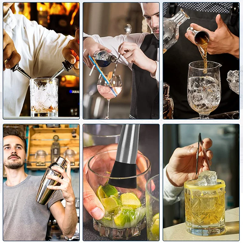 [Аксессуары для бара из 12 штук] набор для коктейлей содержит все необходимое для начала смешивания вкусных напитков, включая шейкер для коктейлей, мерный стаканчик, зажим для льда, штопор, фильтр для льда, палочку для мороженого, ложку для перемешивания, 2 винных пробки, 2 винных пробки, рама для хранения.