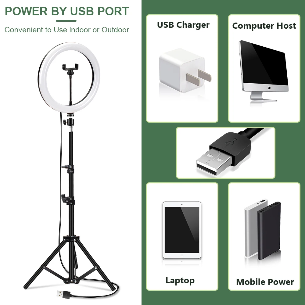 The ringlight set can can connect with computer device,laptop,AC adapter charger.