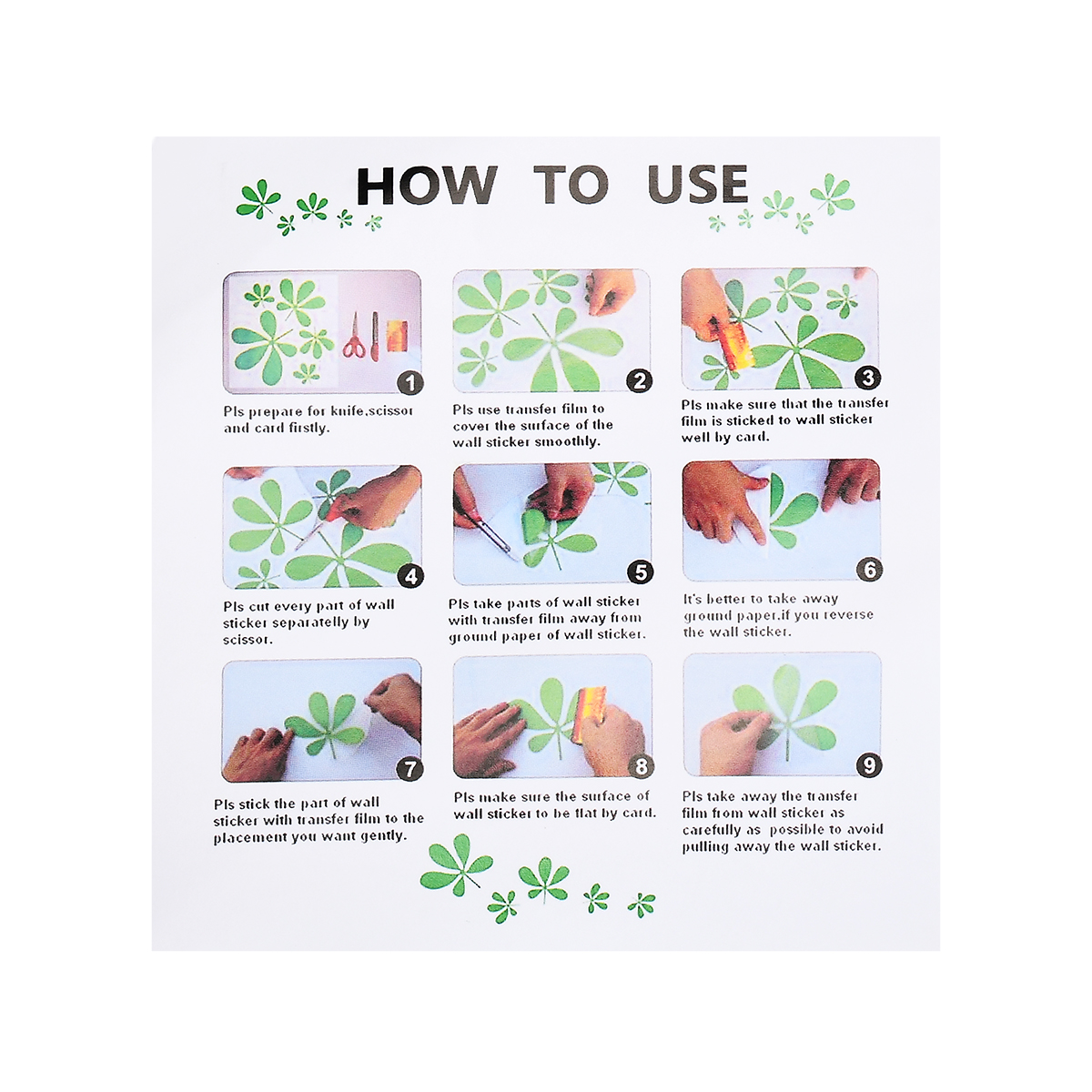 1. Декоративные настенные наклейки могут быть наклеены на плоские стены и кирпичи вручную. Они съемные и водонепроницаемые. Они напечатаны с обеих сторон и изготовлены из экологически чистых ингредиентов.