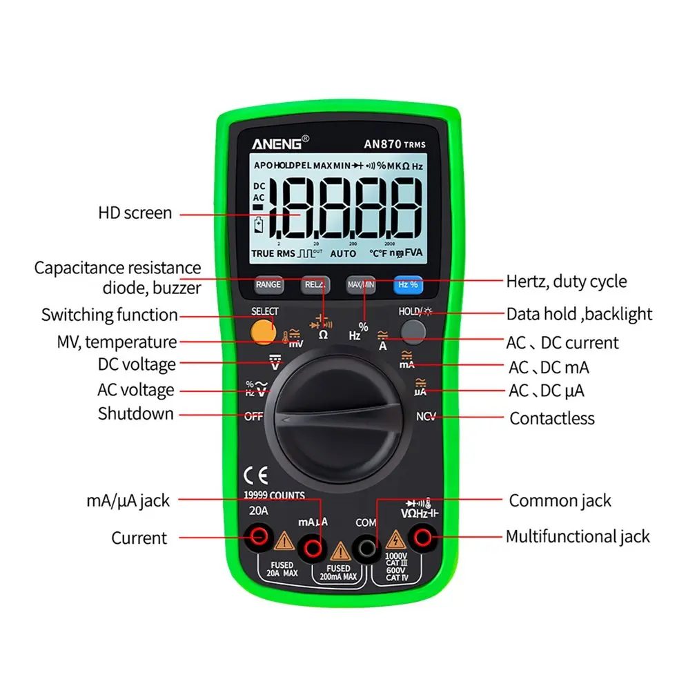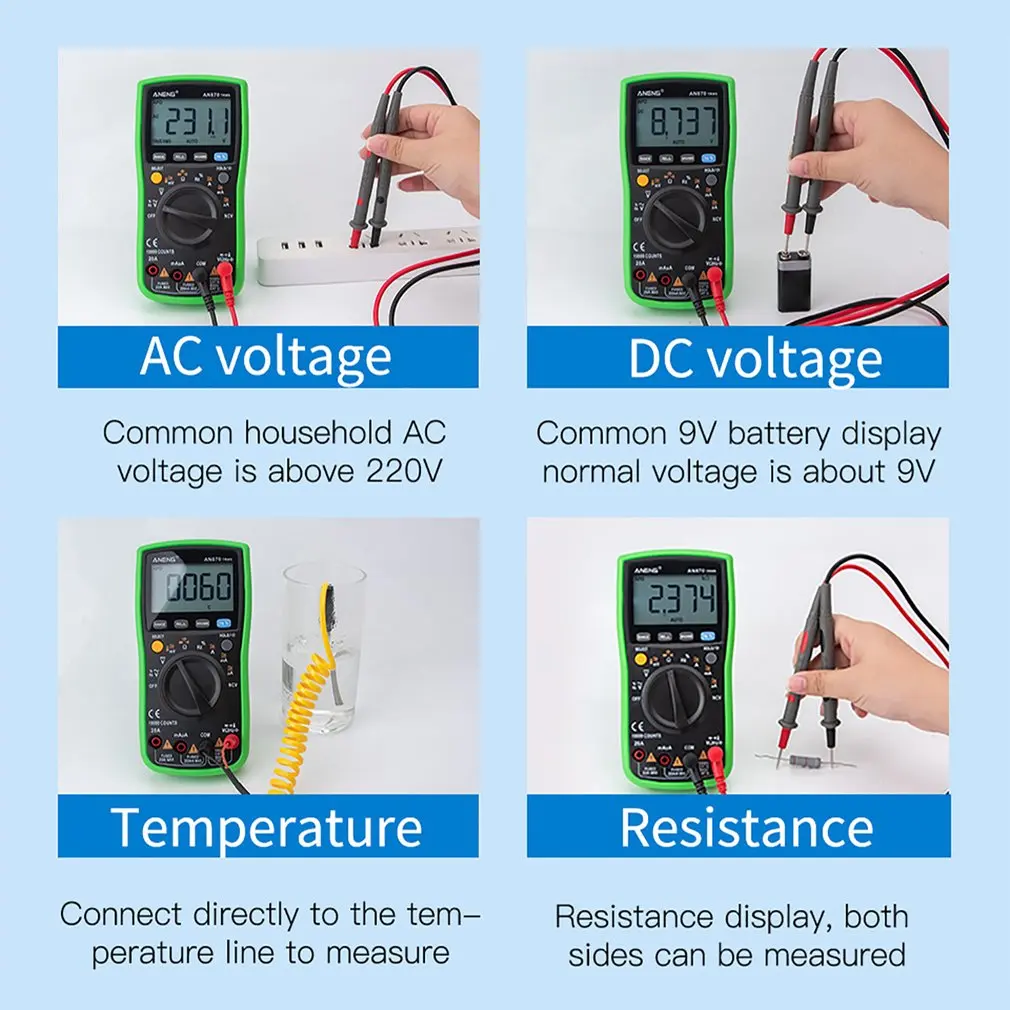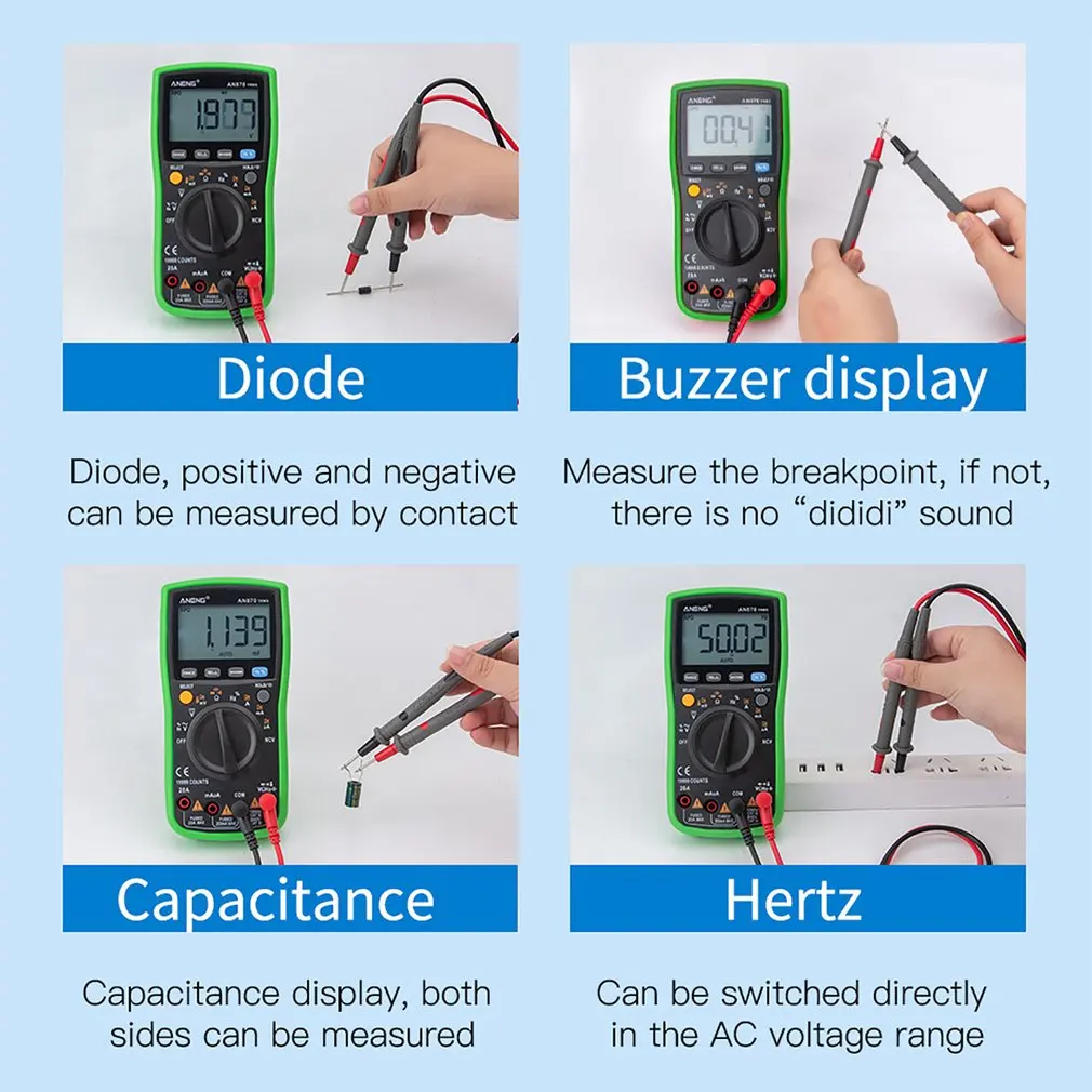 2. Может использоваться для измерения напряжения переменного/постоянного тока, переменного/постоянного тока, сопротивления, емкости, диодов и непрерывности тестирования, температуры, частоты и т. Д.
