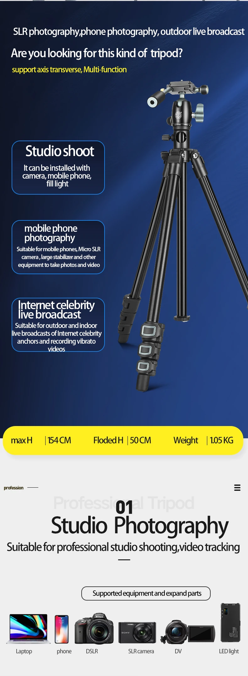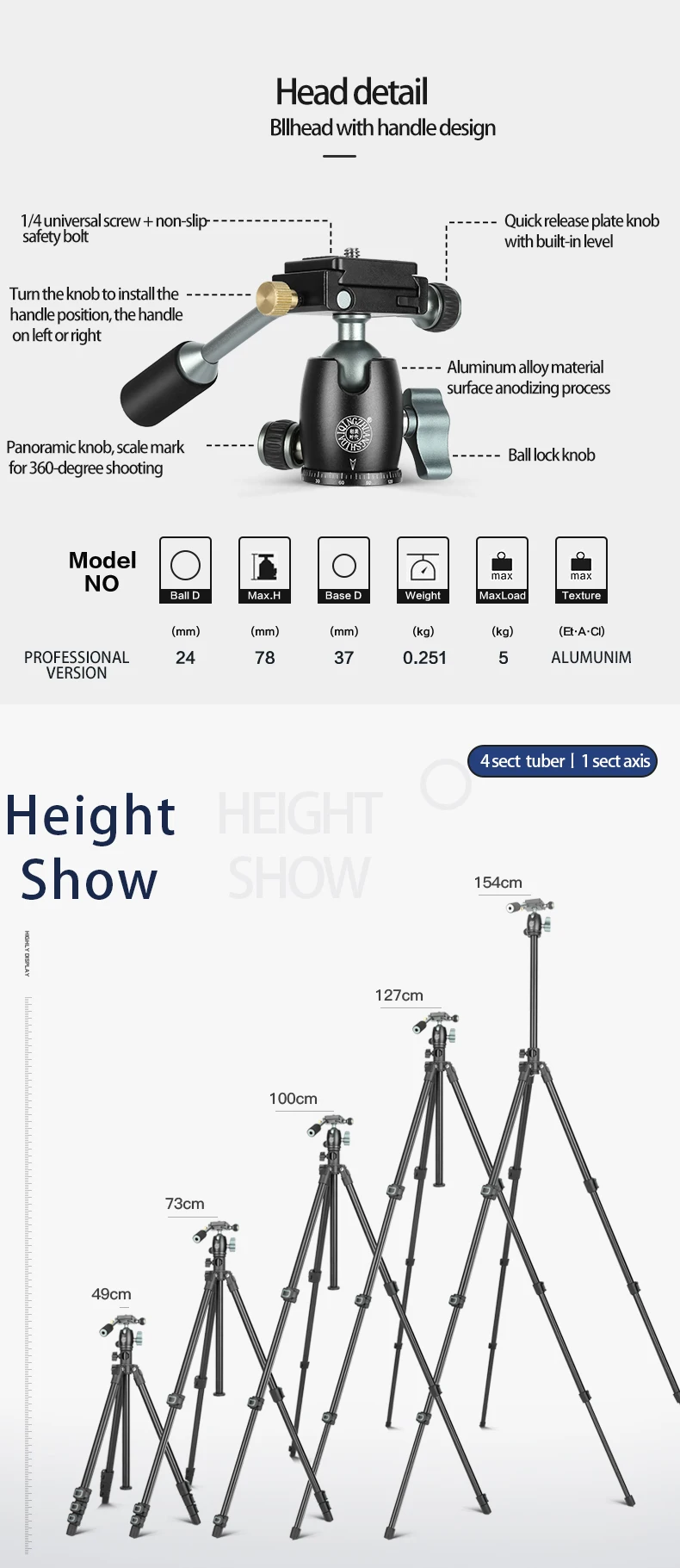 Надежный стабильность: 4-секционный, быстрое освобождение рычаг блокировки ноги для легкой регулировки высоты, 49 см до 154 см. Этот Штатив для телефона может отвечать различным условиям съемки и фотографическим потребностям, что играет важную роль во время вашего путешествия.