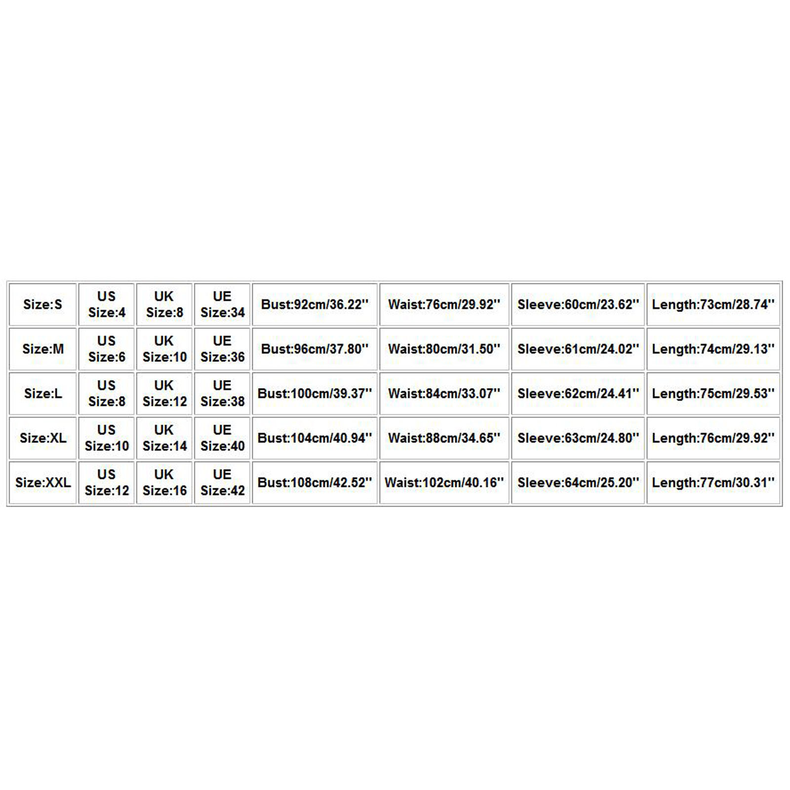Размеры Американский размер Размер Великобритании Размер UE Бюст Талия Рукав Длина S 4 8 34 92 см/36,22'' 76 см/29,92'' 60 см/23,62'' 73 см/28,74'' М 6 10 36 96 см/37,80'' 80 см/31,50'' 61 см/24,02'' 74 см/29,13'' L 8 12 38 100 см/39,37'' 84 см/33,07'' 62 см/24,41'' 75 см/29,53'' XL 10 14 40 104 см/40,94'' 88 см/34,65'' 63 см/24,80'' 76 см/29,92'' XXL 12 16 42 108 см/42,52'' 102 см/40,16'' 64 см/25,20'' 77 см/30,31''
