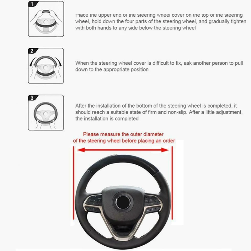 5-Easy Installation: This PU leather steering wheel cover requires hassle-free installation. Simply slip it right on to your steering wheel and your good to go. Just place the cover on top of the steering wheel. Press and hold the upper part of the cover and gradually lower it with both hands on either side to tighten.