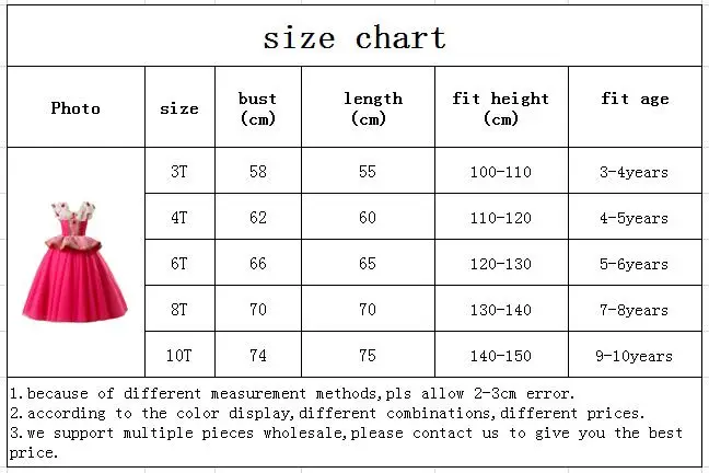 6 размеров в наличии: размер 3 T подходит на рост 100-110 см; Размер 4 T подходит на рост 110-120 см; Размер 6 T подходит на рост 120-130 см; размер 8 T подходит для роста 130-140 см; Размер 10 T подходит для роста 140-150 см; Пожалуйста, выберите правильный размер для вашего роста. Если ваша принцесса весит больше вашего обычного тела, пожалуйста, выберите больший размер.