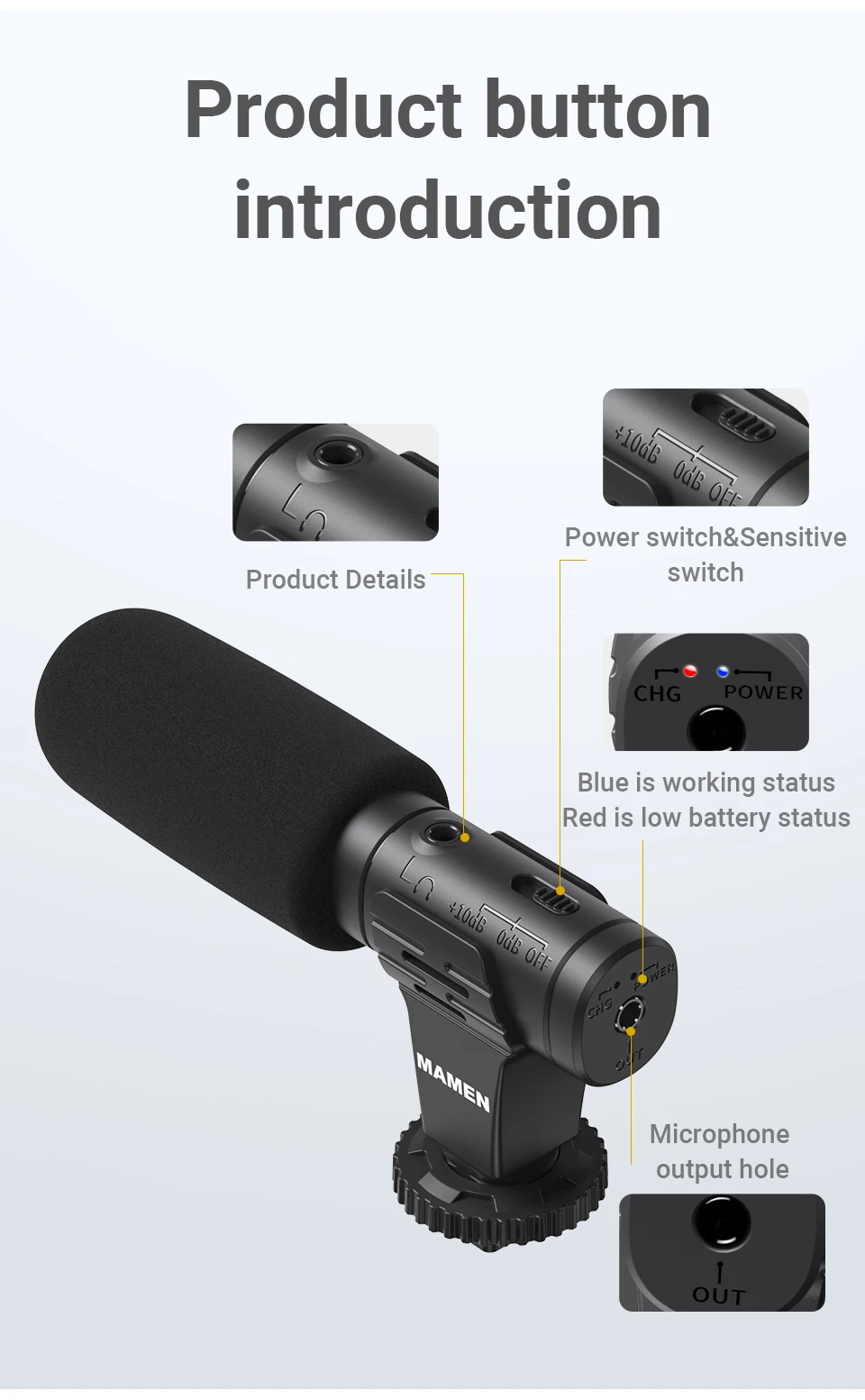 ● Выходной интерфейс 3,5 мм, используемый для подключения камер, мобильных телефонов и т. Д.