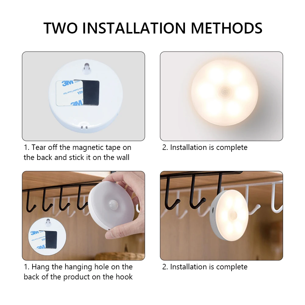 Устанавливается в течение нескольких секунд. Простая и не требуемая проводка. С магнитными клейкими накладками и встроенным магнитом, вы можете приклеиться куда угодно. Подвесное отверстие на корпусе лампы для удобного подвешивания. Идеально подходит для лестниц, шкафов, стен, ванных комнат, шкафов и многого другого.